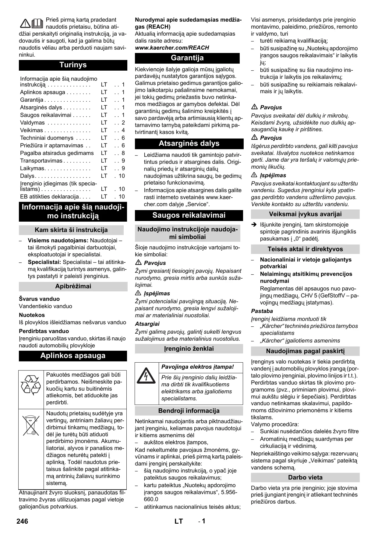 Visiems naudotojams: Naudotojai – tai išmokyti pagalbiniai darbuotojai, eksploatuotojai ir specialistai. Specialistai: Specialistai – tai atitinkamą kvalifikaciją turintys asmenys, galintys pastatyti ir paleisti įrenginius. Apibrėžimai Švarus vanduo Vandentiekio vanduo Nuotekos Iš plovyklos išleidžiamas nešvarus vanduo Perdirbtas vanduo Įrenginiu paruoštas vanduo, skirtas iš naujo naudoti automobilių plovykloje Aplinkos apsauga Nurodymai apie sudedamąsias medžiagas (REACH) Aktualią informaciją apie sudedamąsias dalis rasite adresu: www.kaercher.com/REACH Garantija Kiekvienoje šalyje galioja mūsų įgaliotų pardavėjų nustatytos garantijos sąlygos. Galimus prietaiso gedimus garantijos galiojimo laikotarpiu pašalinsime nemokamai, jei tokių gedimų priežastis buvo netinkamos medžiagos ar gamybos defektai. Dėl garantinių gedimų šalinimo kreipkitės į savo pardavėją arba artimiausią klientų aptarnavimo tarnybą pateikdami pirkimą patvirtinantį kasos kvitą. Atsarginės dalys