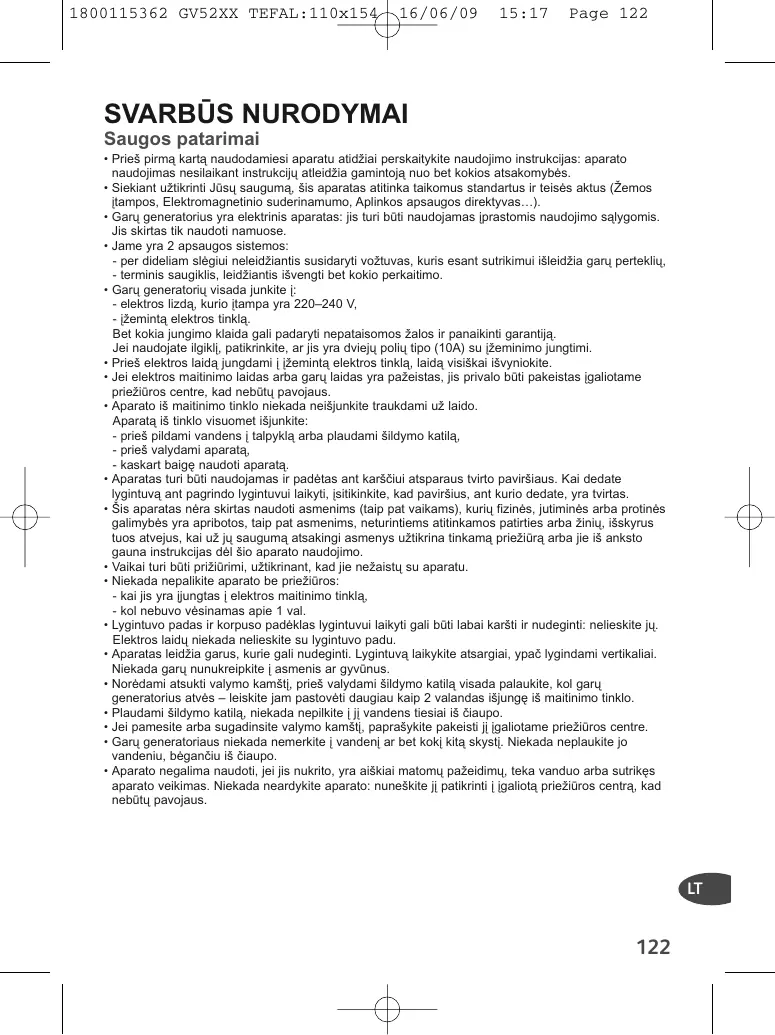 GB SVARBŪS NURODYMAI D Saugos patarimai • Prieš pirmą kartą naudodamiesi aparatu atidžiai perskaitykite naudojimo instrukcijas: aparato naudojimas nesilaikant instrukcijų atleidžia gamintoją nuo bet kokios atsakomybės. • Siekiant užtikrinti Jūsų saugumą, šis aparatas atitinka taikomus standartus ir teisės aktus (Žemos įtampos, Elektromagnetinio suderinamumo, Aplinkos apsaugos direktyvas…). • Garų generatorius yra elektrinis aparatas: jis turi būti naudojamas įprastomis naudojimo sąlygomis. Jis skirtas tik naudoti namuose. • Jame yra 2 apsaugos sistemos: - per dideliam slėgiui neleidžiantis susidaryti vožtuvas, kuris esant sutrikimui išleidžia garų perteklių, - terminis saugiklis, leidžiantis išvengti bet kokio perkaitimo. • Garų generatorių visada junkite į: - elektros lizdą, kurio įtampa yra 220–240 V, - įžemintą elektros tinklą. Bet kokia jungimo klaida gali padaryti nepataisomos žalos ir panaikinti garantiją. Jei naudojate ilgiklį, patikrinkite, ar jis yra dviejų polių tipo (10A) su įžeminimo jungtimi. • Prieš elektros laidą jungdami į įžemintą elektros tinklą, laidą visiškai išvyniokite. • Jei elektros maitinimo laidas arba garų laidas yra pažeistas, jis privalo būti pakeistas įgaliotame priežiūros centre, kad nebūtų pavojaus. • Aparato iš maitinimo tinklo niekada neišjunkite traukdami už laido. Aparatą iš tinklo visuomet išjunkite: - prieš pildami vandens į talpyklą arba plaudami šildymo katilą, - prieš valydami aparatą, - kaskart baigę naudoti aparatą. • Aparatas turi būti naudojamas ir padėtas ant karščiui atsparaus tvirto paviršiaus. Kai dedate lygintuvą ant pagrindo lygintuvui laikyti, įsitikinkite, kad paviršius, ant kurio dedate, yra tvirtas. • Šis aparatas nėra skirtas naudoti asmenims (taip pat vaikams), kurių fizinės, jutiminės arba protinės galimybės yra apribotos, taip pat asmenims, neturintiems atitinkamos patirties arba žinių, išskyrus tuos atvejus, kai už jų saugumą atsakingi asmenys užtikrina tinkamą priežiūrą arba jie iš anksto gauna instrukcijas dėl šio aparato naudojimo. • Vaikai turi būti prižiūrimi, užtikrinant, kad jie nežaistų su aparatu. • Niekada nepalikite aparato be priežiūros: - kai jis yra įjungtas į elektros maitinimo tinklą, - kol nebuvo vėsinamas apie 1 val. • Lygintuvo padas ir korpuso padėklas lygintuvui laikyti gali būti labai karšti ir nudeginti: nelieskite jų. Elektros laidų niekada nelieskite su lygintuvo padu. • Aparatas leidžia garus, kurie gali nudeginti. Lygintuvą laikykite atsargiai, ypač lygindami vertikaliai. Niekada garų nunukreipkite į asmenis ar gyvūnus. • Norėdami atsukti valymo kamštį, prieš valydami šildymo katilą visada palaukite, kol garų generatorius atvės – leiskite jam pastovėti daugiau kaip 2 valandas išjungę iš maitinimo tinklo. • Plaudami šildymo katilą, niekada nepilkite į jį vandens tiesiai iš čiaupo. • Jei pamesite arba sugadinsite valymo kamštį, paprašykite pakeisti jį įgaliotame priežiūros centre. • Garų generatoriaus niekada nemerkite į vandenį ar bet kokį kitą skystį. Niekada neplaukite jo vandeniu, bėgančiu iš čiaupo. • Aparato negalima naudoti, jei jis nukrito, yra aiškiai matomų pažeidimų, teka vanduo arba sutrikęs aparato veikimas. Niekada neardykite aparato: nuneškite jį patikrinti į įgaliotą priežiūros centrą, kad nebūtų pavojaus.