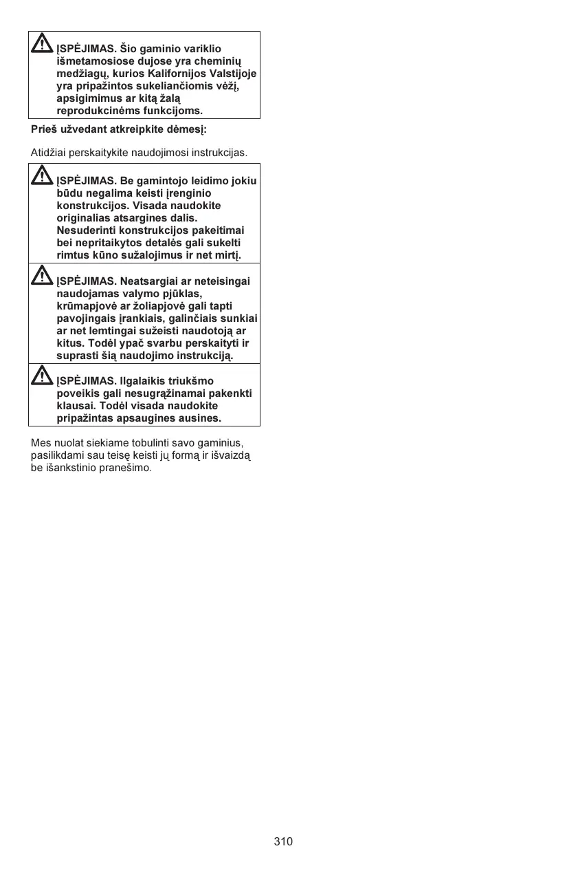 Contrôler les points suivants avant la mise en marche : Lisez attentivement le manuel d’utilisation. AVERTISSEMENT : Ne jamais modifier sous aucun prétexte la machine sans l’autorisation du fabricant. N’utiliser que des accessoires et des pièces d’origine. Des modifications nonautorisées et l’emploi d’accessoires non-homologués peuvent provoquer des accidents graves et même mortels, à l’utilisateur ou d’autres personnes. AVERTISSEMENT : Utilisés de manière négligente ou erronée, les scies d'éclaircissement et les coupe-herbes peuvent devenir des outils dangereux pouvant occasionner des blessures très graves, voire mortelles à l’utilisateur ou à d’autres personnes présentes. Il est très important de lire attentivement et de bien assimiler le contenu de ce manuel de l'opérateur. AVERTISSEMENT : Une exposition prolongée au bruit risque de causer des lésions auditives permanentes. Toujours utiliser des protecteurs d'oreilles agréés. Nous travaillons continuellement au développement de ses produits et nous réservons le droit d’en modifier, entre autres, la conception et l’aspect sans préavis.