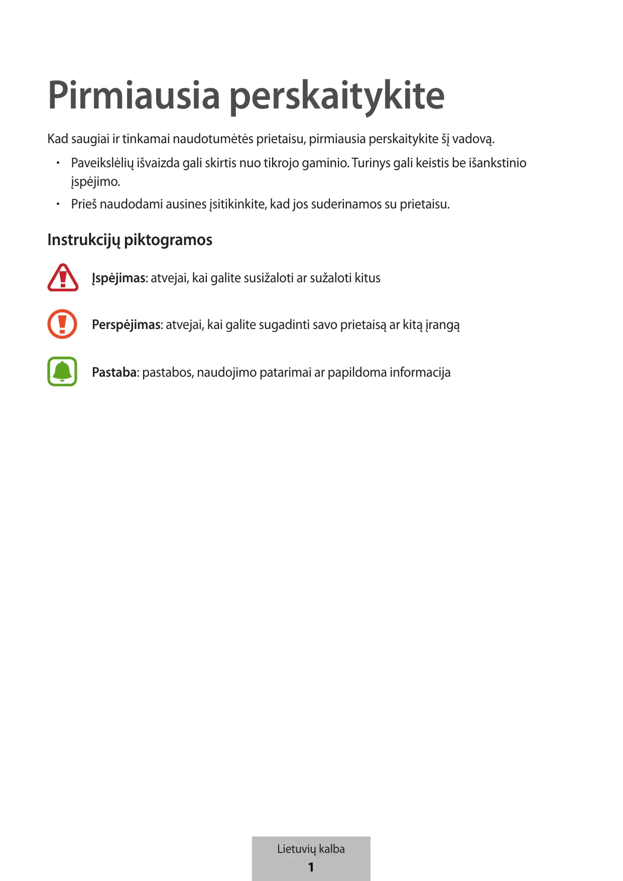 - Prieš naudodami ausines įsitikinkite, kad jos suderinamos su prietaisu. Instrukcijų piktogramos Įspėjimas: atvejai, kai galite susižaloti ar sužaloti kitus Perspėjimas: atvejai, kai galite sugadinti savo prietaisą ar kitą įrangą Pastaba: pastabos, naudojimo patarimai ar papildoma informacija Lietuvių kalba