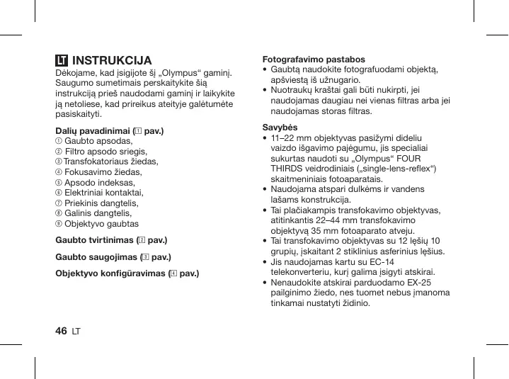 ZUIKO DIGITAL 11-22 MM 1:2.8-3.5 - Fotoaparato objektyvas OLYMPUS - Notice d'utilisation et mode d'emploi gratuit