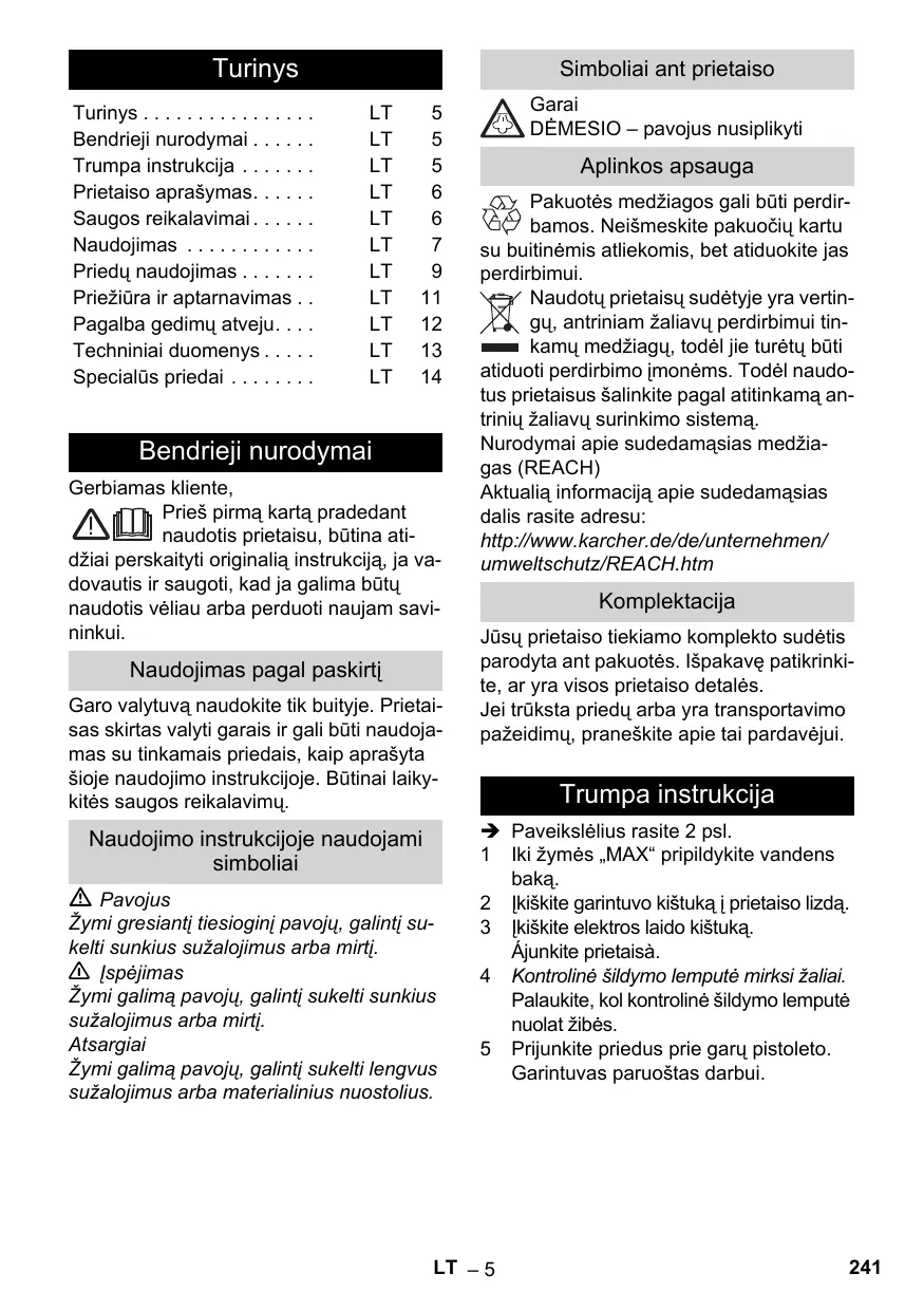 Bendrieji nurodymai Gerbiamas kliente, Prieš pirmą kartą pradedant naudotis prietaisu, būtina atidžiai perskaityti originalią instrukciją, ja vadovautis ir saugoti, kad ja galima būtų naudotis vėliau arba perduoti naujam savininkui. Naudojimas pagal paskirtį Garo valytuvą naudokite tik buityje. Prietaisas skirtas valyti garais ir gali būti naudojamas su tinkamais priedais, kaip aprašyta šioje naudojimo instrukcijoje. Būtinai laikykitės saugos reikalavimų. Naudojimo instrukcijoje naudojami simboliai Pavojus Žymi gresiantį tiesioginį pavojų, galintį sukelti sunkius sužalojimus arba mirtį. 몇 Įspėjimas Žymi galimą pavojų, galintį sukelti sunkius sužalojimus arba mirtį. Atsargiai Žymi galimą pavojų, galintį sukelti lengvus sužalojimus arba materialinius nuostolius. Garai DĖMESIO – pavojus nusiplikyti Aplinkos apsauga Pakuotės medžiagos gali būti perdirbamos. Neišmeskite pakuočių kartu su buitinėmis atliekomis, bet atiduokite jas perdirbimui. Naudotų prietaisų sudėtyje yra vertingų, antriniam žaliavų perdirbimui tinkamų medžiagų, todėl jie turėtų būti atiduoti perdirbimo įmonėms. Todėl naudotus prietaisus šalinkite pagal atitinkamą antrinių žaliavų surinkimo sistemą. Nurodymai apie sudedamąsias medžiagas (REACH) Aktualią informaciją apie sudedamąsias dalis rasite adresu: http://www.karcher.de/de/unternehmen/ umweltschutz/REACH.htm Komplektacija Jūsų prietaiso tiekiamo komplekto sudėtis parodyta ant pakuotės. Išpakavę patikrinkite, ar yra visos prietaiso detalės. Jei trūksta priedų arba yra transportavimo pažeidimų, praneškite apie tai pardavėjui. Trumpa instrukcija Î Paveikslėlius rasite 2 psl. 1 Iki žymės „MAX“ pripildykite vandens baką. 2 Įkiškite garintuvo kištuką į prietaiso lizdą. 3 Įkiškite elektros laido kištuką. Ájunkite prietaisà. 4 Kontrolinė šildymo lemputė mirksi žaliai. Palaukite, kol kontrolinė šildymo lemputė nuolat žibės. 5 Prijunkite priedus prie garų pistoleto. Garintuvas paruoštas darbui. LT – 5