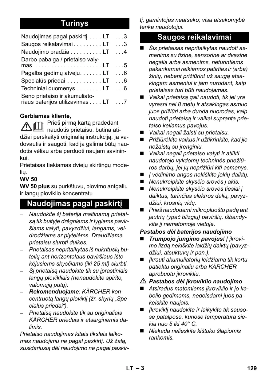 Gerbiamas kliente, Prieš pirmą kartą pradedant naudotis prietaisu, būtina atidžiai perskaityti originalią instrukciją, ja vadovautis ir saugoti, kad ja galima būtų naudotis vėliau arba perduoti naujam savininkui. Prietaisas tiekiamas dviejų skirtingų modelių. WV 50 WV 50 plus su purkštuvu, plovimo antgaliu ir langų ploviklio koncentratu Naudojimas pagal paskirtį Naudokite šį baterija maitinamą prietaisą tik buityje drėgniems ir lygiams paviršiams valyti, pavyzdžiui, langams, veidrodžiams ar plytelėms. Draudžiama prietaisu siurbti dulkes. – Prietaisas nepritaikytas iš nukritusių butelių ant horizontalaus paviršiaus ištekėjusiems skysčiams (iki 25 ml) siurbti. – Šį prietaisą naudokite tik su įprastiniais langų plovikliais (nenaudokite spirito, valomųjų putų). – Rekomenduojame: KÄRCHER koncentruotą langų ploviklį (žr. skyrių „Specialūs priedai“). – Prietaisą naudokite tik su originaliais KÄRCHER priedais ir atsarginėmis dalimis. Prietaiso naudojimas kitais tikslais laikomas naudojimu ne pagal paskirtį. Už žalą, susidariusią dėl naudojimo ne pagal paskir– Saugos reikalavimai Šis prietaisas nepritaikytas naudoti asmenims su fizine, sensorine ar dvasine negalia arba asmenims, neturintiems pakankamai reikiamos patirties ir (arba) žinių, nebent prižiūrint už saugą atsakingam asmeniui ir jam nurodant, kaip prietaisas turi būti naudojamas. Vaikai prietaisą gali naudoti, tik jei yra vyresni nei 8 metų ir atsakingas asmuo juos prižiūri arba duoda nuorodas, kaip naudoti prietaisą ir vaikai supranta prietaiso keliamus pavojus. Vaikai negali žaisti su prietaisu. Prižiūrėkite vaikus ir užtikrinkite, kad jie nežaistų su įrenginiu. Vaikai negali prietaiso valyti ir atlikti naudotojo vykdomų techninės priežiūros darbų, jei jų neprižiūri kiti asmenys. Į vėdinimo angas nekiškite jokių daiktų. Nenukreipkite skysčio srovės į akis. Nenukreipkite skysčio srovės tiesiai į daiktus, turinčias elektros dalių, pavyzdžiui, krosnių vidų. Prieš naudodami mikropluošto padą ant jautrių (ypač blizgių) paviršių, išbandykite jį nematomoje vietoje. Pastabos dėl baterijos naudojimo Trumpojo jungimo pavojus! Į įkrovimo lizdą nekiškite laidžių daiktų (pavyzdžiui, atsuktuvų ir pan.). Įkrauti akumuliatorių leidžiama tik kartu patiektu originaliu arba KÄRCHER aprobuotu įkrovikliu. Pastabos dėl įkroviklio naudojimo Atsiradus matomiems įkroviklio ir jo kabelio gedimams, nedelsdami juos pakeiskite naujais. Įkroviklį naudokite ir laikykite tik sausose patalpose, kuriose temperatūra siekia nuo 5 iki 40° C. Niekada nelieskite kištuko šlapiomis rankomis. LT – 3