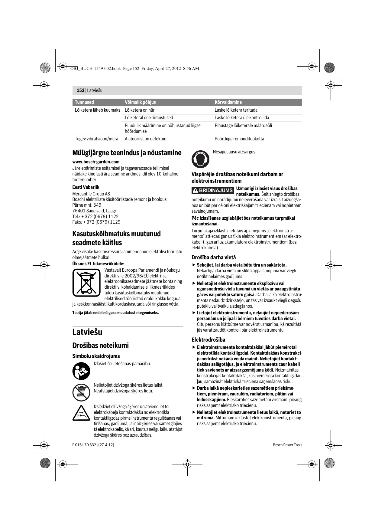 Saagimisfunktsioon Kuigi lõiketera hammaste vahekaugus lubab lõigata oksi läbimõõduga kuni Ø 26/34 mm, sobib lõiketera ots kuni Ø 32/38 mm läbimõõduga okste lõikamiseks. Vea otsing Tunnused Võimalik põhjus Hekikäärid ei käivitu Puudub võrgupinge Kontrollige ja lülitage sisse Pistikupesa on defektne Kasutage teist pistikupesa Toitejuhe on kahjustada saanud Kontrollige toitejuhet ettevaatlikult; väljavahetamiseks pöörduge remonditöökotta Eraldi pikendusjuhe on kahjustada saanud Kontrollige pikendusjuhe üle ja vahetage välja, kui see on kahjustada saanud Kaitse on rakendunud Vahetage kaitse välja Toitejuhe on kahjustada saanud Kontrollige toitejuhet ettevaatlikult; väljavahetamiseks pöörduge remonditöökotta Eraldi pikendusjuhe on kahjustada saanud Kontrollige pikendusjuhe üle ja vahetage välja, kui see on kahjustada saanud Hekikäärid töötavad katkendlikult Mootor töötab, lõiketera jääb seisma Bosch Power Tools Kõrvaldamine Seadme siseühendused ei ole korras Pöörduge remonditöökotta Lüliti (sisse/välja) on defektne Pöörduge remonditöökotta Sisemine viga Pöörduge remonditöökotta F 016 L70 832 | (27.4.12) OBJ_BUCH-1549-002.book Page 152 Friday, April 27, 2012 8:56 AM 152 | Latviešu Tunnused Võimalik põhjus Kõrvaldamine Lõiketera läheb kuumaks Lõiketera on nüri Tugev vibratsioon/müra Lõiketeral on kriimustused Laske lõiketera üle kontrollida Puudulik määrimine on põhjustanud liigse hõõrdumise Pihustage lõiketerale määrdeõli Aiatööriist on defektne Pöörduge remonditöökotta Müügijärgne teenindus ja nõustamine www.bosch-garden.com Järelepärimiste esitamisel ja tagavaraosade tellimisel näidake kindlasti ära seadme andmesildil olev 10-kohaline tootenumber. Eesti Vabariik Mercantile Group AS Boschi elektriliste käsitööriistade remont ja hooldus Pärnu mnt. 549 76401 Saue vald, Laagri Tel.: + 372 (0679) 1122 Faks: + 372 (0679) 1129 Kasutuskõlbmatuks muutunud seadmete käitlus Ärge visake kasutusressursi ammendanud elektrilisi tööriistu olmejäätmete hulka! Üksnes EL liikmesriikidele: Vastavalt Euroopa Parlamendi ja nõukogu direktiivile 2002/96/EÜ elektri- ja elektroonikaseadmete jäätmete kohta ning direktiivi kohaldamisele liikmesriikides tuleb kasutuskõlbmatuks muutunud elektrilised tööriistad eraldi kokku koguda ja keskkonnasäästlikult korduskasutada või ringlusse võtta. Tootja jätab endale õiguse muudatuste tegemiseks. Latviešu Drošības noteikumi Simbolu skaidrojums Izlasiet šo lietošanas pamācību. Nelietojiet dzīvžoga šķēres lietus laikā. Neatstājiet dzīvžoga šķēres lietū. Izslēdziet dzīvžoga šķēres un atvienojiet to elektrokabeļa kontaktdakšu no elektrotīkla kontaktligzdas pirms instrumenta regulēšanas vai tīrīšanas, gadījumā, ja ir aizķēries vai samezglojies tā elektrokabelis, kā arī, kaut uz neilgu laiku atstājot dzīvžoga šķēres bez uzraudzības. F 016 L70 832 | (27.4.12) Laske lõiketera teritada Nēsājiet ausu aizsargus. Vispārējie drošības noteikumi darbam ar elektroinstrumentiem BRĪDINĀJUMS Uzmanīgi izlasiet visus drošības noteikumus. Šeit sniegto drošības noteikumu un norādījumu neievērošana var izraisīt aizdegšanos un būt par cēloni elektriskajam triecienam vai nopietnam savainojumam. Pēc izlasīšanas uzglabājiet šos noteikumus turpmākai izmantošanai. Turpmākajā izklāstā lietotais apzīmējums „elektroinstruments“ attiecas gan uz tīkla elektroinstrumentiem (ar elektrokabeli), gan arī uz akumulatora elektroinstrumentiem (bez elektrokabeļa). Drošība darba vietā f Sekojiet, lai darba vieta būtu tīra un sakārtota. Nekārtīgā darba vietā un sliktā apgaismojumā var viegli notikt nelaimes gadījums. f Nelietojiet elektroinstrumentu eksplozīvu vai ugunsnedrošu vielu tuvumā un vietās ar paaugstinātu gāzes vai putekļu saturu gaisā. Darba laikā elektroinstruments nedaudz dzirksteļo, un tas var izsaukt viegli degošu putekļu vai tvaiku aizdegšanos. f Lietojot elektroinstrumentu, neļaujiet nepiederošām personām un jo īpaši bērniem tuvoties darba vietai. Citu personu klātbūtne var novērst uzmanību, kā rezultātā jūs varat zaudēt kontroli pār elektroinstrumentu. Elektrodrošība f Elektroinstrumenta kontaktdakšai jābūt piemērotai elektrotīkla kontaktligzdai. Kontaktdakšas konstrukciju nedrīkst nekādā veidā mainīt. Nelietojiet kontaktdakšas salāgotājus, ja elektroinstruments caur kabeli tiek savienots ar aizsargzemējuma ķēdi. Neizmainītas konstrukcijas kontaktdakša, kas piemērota kontaktligzdai, ļauj samazināt elektriskā trieciena saņemšanas risku. f Darba laikā nepieskarieties sazemētiem priekšmetiem, piemēram, caurulēm, radiatoriem, plītīm vai ledusskapjiem. Pieskaroties sazemētām virsmām, pieaug risks saņemt elektrisko triecienu. f Nelietojiet elektroinstrumentu lietus laikā, neturiet to mitrumā. Mitrumam iekļūstot elektroinstrumentā, pieaug risks saņemt elektrisko triecienu. Bosch Power Tools OBJ_BUCH-1549-002.book Page 153 Friday, April 27, 2012 8:56 AM Latviešu | 153 f Nenesiet un nepiekariet elektroinstrumentu aiz elektrokabeļa. Neraujiet aiz kabeļa, ja vēlaties atvienot instrumentu no elektrotīkla kontaktligzdas. Sargājiet elektrokabeli no karstuma, eļļas, asām šķautnēm un elektroinstrumenta kustīgajām daļām. Bojāts vai samezglojies elektrokabelis var būt par cēloni elektriskajam triecienam. f Darbinot elektroinstrumentu ārpus telpām, izmantojiet tā pievienošanai vienīgi tādus pagarinātājkabeļus, kuru lietošana ārpus telpām ir atļauta. Lietojot elektrokabeli, kas piemērots darbam ārpus telpām, samazinās risks saņemt elektrisko triecienu. f Ja elektroinstrumentu tomēr nepieciešams lietot vietās ar paaugstinātu mitrumu, izmantojiet tā pievienošanai noplūdes strāvas aizsargreleju. Lietojot noplūdes strāvas aizsargreleju, samazinās risks saņemt elektrisko triecienu. Personisk