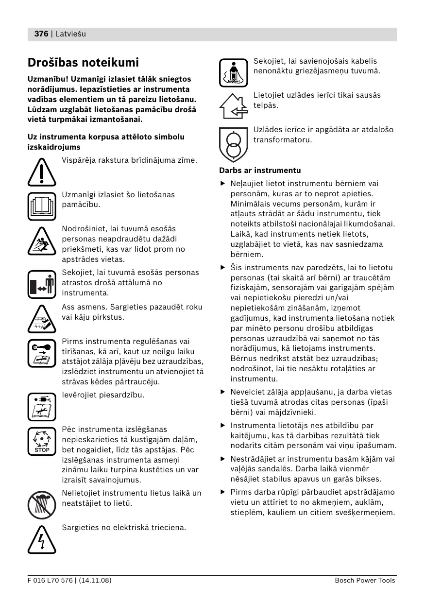 Uz instrumenta korpusa attēloto simbolu izskaidrojums Uzlādes ierīce ir apgādāta ar atdalošo transformatoru. Vispārēja rakstura brīdinājuma zīme. Darbs ar instrumentu Uzmanīgi izlasiet šo lietošanas pamācību. Nodrošiniet, lai tuvumā esošās personas neapdraudētu dažādi priekšmeti, kas var lidot prom no apstrādes vietas. Sekojiet, lai tuvumā esošās personas atrastos drošā attālumā no instrumenta. Ass asmens. Sargieties pazaudēt roku vai kāju pirkstus. Pirms instrumenta regulēšanas vai tīrīšanas, kā arī, kaut uz neilgu laiku atstājot zālāja pļāvēju bez uzraudzības, izslēdziet instrumentu un atvienojiet tā strāvas ķēdes pārtraucēju. Ievērojiet piesardzību. STOP Pēc instrumenta izslēgšanas nepieskarieties tā kustīgajām daļām, bet nogaidiet, līdz tās apstājas. Pēc izslēgšanas instrumenta asmeņi zināmu laiku turpina kustēties un var izraisīt savainojumus. Nelietojiet instrumentu lietus laikā un neatstājiet to lietū. f Neļaujiet lietot instrumentu bērniem vai personām, kuras ar to neprot apieties. Minimālais vecums personām, kurām ir atļauts strādāt ar šādu instrumentu, tiek noteikts atbilstoši nacionālajai likumdošanai. Laikā, kad instruments netiek lietots, uzglabājiet to vietā, kas nav sasniedzama bērniem. f Šis instruments nav paredzēts, lai to lietotu personas (tai skaitā arī bērni) ar traucētām fiziskajām, sensorajām vai garīgajām spējām vai nepietiekošu pieredzi un/vai nepietiekošām zināšanām, izņemot gadījumus, kad instrumenta lietošana notiek par minēto personu drošību atbildīgas personas uzraudzībā vai saņemot no tās norādījumus, kā lietojams instruments. Bērnus nedrīkst atstāt bez uzraudzības; nodrošinot, lai tie nesāktu rotaļāties ar instrumentu. f Neveiciet zālāja appļaušanu, ja darba vietas tiešā tuvumā atrodas citas personas (īpaši bērni) vai mājdzīvnieki. f Instrumenta lietotājs nes atbildību par kaitējumu, kas tā darbības rezultātā tiek nodarīts citām personām vai viņu īpašumam. f Nestrādājiet ar instrumentu basām kājām vai vaļējās sandalēs. Darba laikā vienmēr nēsājiet stabilus apavus un garās bikses. f Pirms darba rūpīgi pārbaudiet apstrādājamo vietu un attīriet to no akmeņiem, auklām, stieplēm, kauliem un citiem svešķermeņiem. Sargieties no elektriskā trieciena. F 016 L70 576 | (14.11.08) Bosch Power Tools Latviešu | 377 f Ik reizi pirms darba pārbaudiet, vai instrumenta asmens, tā stiprinājuma skrūves un griezējmezgls nav nolietojies vai bojāts. Lai saglabātos griezējmezgla līdzsvarojums, nomainiet nolietoto vai bojāto asmeni un tā stiprinājuma skrūves tikai komplekta sastāvā. f Veiciet appļaušanu tikai diennakts gaišajā laikā vai labā mākslīgajā apgaismojumā. f Ja iespējams, nelietojiet zālāja pļāvēju mitras zāles appļaušanai. f Darba laikā vienmēr pārvietojieties mērenā gaitā, ejot vienmērīgiem soļiem. f Nelietojiet instrumentu ar bojātām aizsargierīcēm vai pārsegiem vai arī bez aizsargierīcēm, piemēram, bez aizsargvāka un/vai bez zāles savācējtvertnes. f Darbs nogāzēs var būt bīstams. – Neappļaujiet stipri stāvas nogāzes. – Apstrādājot nogāzes vai strādājot mitrā zālē, ieturiet drošu līdzsvaru. – Vienmēr pārvietojiet zālāja pļāvēju gar nogāzi, bet ne augšup vai lejup pa to. – Ievērojiet īpašu piesardzību, mainot apstrādes virzienu slīpā vietā. f Ieslēdziet instrumentu, kā norādīts tā lietošanas pamācībā, stāvot drošā attālumā no rotējošajām daļām. f Nenovietojiet rokas vai kājas tuvu instrumenta rotējošajām daļām vai zem tām. f Strādājot ar instrumentu, ieturiet drošu attālumu no atkritumu izmešanas zonas. f Neceliet un nenesiet instrumentu, ja darbojas tā dzinējs. Atvienojiet strāvas ķēdes pārtraucēju: – vienmēr, kad instruments tiek atstāts bez uzraudzības, – atbrīvojot iestrēgušās daļas, – pirms instrumenta pārbaudes, tīrīšanas vai citas darbības ar to, – pēc instrumenta saduršanās ar kādu priekšmetu. Šādā gadījumā jāpārbauda, vai instrumentam nav radušies bojājumi un vajadzības gadījumā jāveic remonts, – ja instruments sāk neparasti stipri vibrēt (šādā gadījumā pārbaude jāveic nekavējoties). Apkalpošana f Īpaši uzmanieties, ja darba gaitā nākas kāpties atpakaļ vai pārvietot instrumentu virzienā uz sevi. f Pārbaudiet, vai visi instrumenta uzgriežņi un skrūves ir stingri pieskrūvētas un tā tehniskais stāvoklis ir apmierinošs. f Zālāja appļaušanas laikā vienmēr pārvietojiet zālāja pļāvēju uz priekšu, bet nekad virzienā uz sevi. f Regulāri pārbaudiet zāles savācējtvertnes stāvokli un nolietošanās pakāpi. f Ja instruments tiek pārvietots pa vietām bez zālāja pārklājuma, uz zālāja appļaušanas vietu vai no tās, kā arī laikā, kad tas ir noliekts sānu virzienā, instrumenta asmenim jābūt nekustīgam. f Instrumenta palaišanas brīdī tam jāatrodas horizontālā stāvoklī, izņemot gadījumus, kad instruments nedaudz jānoliec, lai atvieglotu tā iedarbināšanu garā zālē. Šādās reizēs nolieciet instrumentu tikai par minimāli nepieciešamo leņķi, nospiežot lejup tā rokturi un paceļot augšup no sevis tālāko instrumenta daļu. Pirms instrumenta nolaišanas atpakaļ horizontālā stāvoklī novietojiet abas rokas uz tā roktura. Bosch Power Tools f Lai panāktu augstu darba drošību, pārbaudiet instrumentu un nomainiet tā izdilušās vai bojātās daļas. f Nomaiņai izmantojiet vienīgi piemērota tipa griezējasmeni, kas paredzēts šim instrumentam. f Nodrošiniet, lai nomaiņai tiktu izmantotas vienīgi oriģinālās rezerves daļas, kas ražotas firmā Bosch. f Rīkojoties ar aso asmeni vai strādājot tā tuvumā, vienmēr uzvelciet dārznieka aizsargcimdus. F 016 L70 576 | (14.11.08) 378 | Latviešu Pareiza apiešanās ar akum
