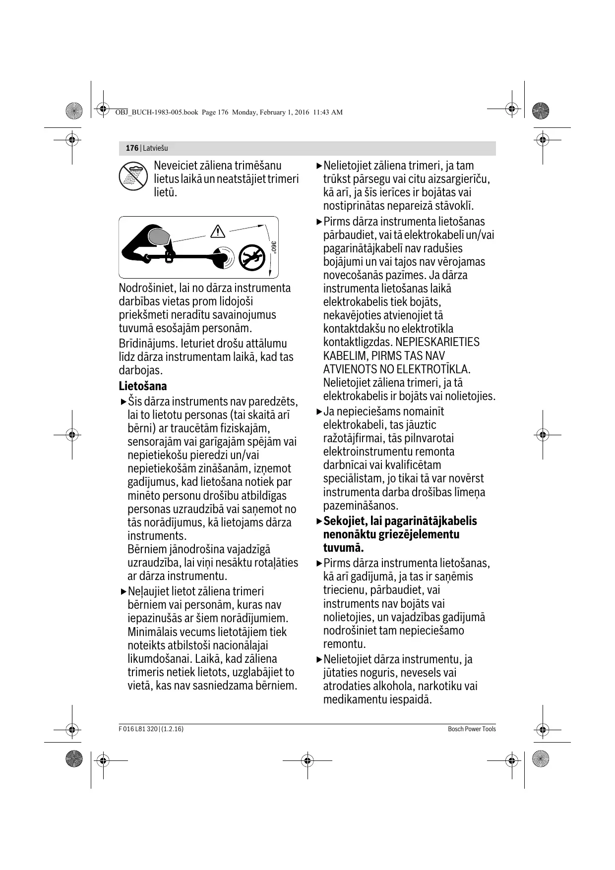 ATVIENOTS NO ELEKTROTĪKLA. Nelietojiet zāliena trimeri, ja tā elektrokabelis ir bojāts vai nolietojies. Ja nepieciešams nomainīt elektrokabeli, tas jāuztic ražotājfirmai, tās pilnvarotai elektroinstrumentu remonta darbnīcai vai kvalificētam speciālistam, jo tikai tā var novērst instrumenta darba drošības līmeņa pazemināšanos. Sekojiet, lai pagarinātājkabelis nenonāktu griezējelementu tuvumā. Pirms dārza instrumenta lietošanas, kā arī gadījumā, ja tas ir saņēmis triecienu, pārbaudiet, vai instruments nav bojāts vai nolietojies, un vajadzības gadījumā nodrošiniet tam nepieciešamo remontu. Nelietojiet dārza instrumentu, ja jūtaties noguris, nevesels vai atrodaties alkohola, narkotiku vai medikamentu iespaidā. Bosch Power Tools OBJ_BUCH-1983-005.book Page 177 Monday, February 1, 2016 11:43 AM Latviešu | 177 Darba laikā nēsājiet garas bikses no Ieslēdziet zāliena trimeri vienīgi tad, stingra auduma, stabilus apavus un aizsargcimdus. Nenēsājiet platu apģērbu un rotaslietas, nestrādājiet īsās biksēs, sandalēs vai basām kājām. Lai novērstu garu matu ieķeršanos instrumenta kustīgajās daļās, uzsieniet tos virs plecu augstuma. Strādājot ar dārza instrumentu, nēsājiet aizsargbrilles un ausu aizsargus. Saglabājiet stingru stāju un nezaudējiet līdzsvaru. Darba laikā nepakļaujiet sevi stiprai piepūlei. Nelietojiet zāliena trimeri, ja darba vietas tiešā tuvumā atrodas citas personas (īpaši bērni), kā arī mājdzīvnieki. Instrumenta lietotājs nes atbildību par kaitējumu, kas tā darbības rezultātā tiek nodarīts citām personām vai viņu īpašumam. Nepieskarieties rotējošajiem griezējelementiem, bet nogaidiet, līdz tie pilnīgi apstājas. Griezējelementi zināmu laiku turpina rotēt arī pēc zāliena trimera izslēgšanas un var radīt savainojumus. Strādājiet tikai diennakts gaišajā laikā vai labā mākslīgajā apgaismojumā. Nestrādājiet ar zāliena trimeri sliktos laika apstākļos un jo īpaši negaisa laikā. Lietojot zāliena trimeri mitrā zālē, samazinās tā jauda. Izslēdziet zāliena trimeri, transportējot to uz darba vietu vai no tās. ja Jūsu rokas un kājas atrodas drošā attālumā no rotējošajiem griezējelementiem. Netuviniet rokas un kājas rotējošajiem griezējelementiem. Neizmantojiet šajā zāliena trimerī metāla griezējelementus. Regulāri pārbaudiet zāliena trimeri un veiciet tam nepieciešamo apkalpošanu. Nodrošiniet, lai zāliena trimeris tiktu remontēts vienīgi pilnvarotā remonta darbnīcā. Sekojiet, lai instrumenta ventilācijas atveres nenosprostotu zāles paliekas. Sargieties no savainošanās ar aizsargpārsegā iebūvēto asmeni, kas paredzēts griezējauklas apgriešanai vajadzīgajā garumā. Pēc griezējauklas ietīšanas vai spoles nomaiņas un pirms trimera ieslēgšanas vienmēr pagrieziet instrumentu līmeniskā darba stāvoklī. Izslēdziet dārza instrumentu un atvienojiet tā kontaktdakšu no elektrotīkla kontaktligzdas šādos gadījumos: – vienmēr, kad dārza instruments tiek atstāts bez uzraudzības – pirms griezējauklas spoles nomaiņas – pirms zāliena trimera tīrīšanas vai veicot citus darbus ar to Ik reizi pēc darba atvienojiet dārza instrumenta kontaktdakšu no elektrotīkla un pārbaudiet, vai instrumentam nav radušies bojājumi. Bosch Power Tools F 016 L81 320 | (1.2.16) OBJ_BUCH-1983-005.book Page 178 Monday, February 1, 2016 11:43 AM 178 | Latviešu Uzglabājiet dārza instrumentu sausā, drošā vietā, kur tas nav sasniedzams bērniem. Nenovietojiet uz dārza instrumenta citus priekšmetus. Drošības apsvērumu dēļ nomainiet nolietotās vai bojātās daļas. Nodrošiniet, lai nomaiņai tiktu izmantotas vienīgi oriģinālās rezerves daļas, kas ražotas firmā Bosch. Nesāciet lietot dārza instrumentu, ja uz tā nav nostiprinātas visas instrumentam piederīgās daļas. Elektriskā drošība Uzmanību! Pirms apkalpošanas vai tīrīšanas izslēdziet dārza instrumentu un atvienojiet tā kontaktdakšu no elektrotīkla. Rīkojieties šādi arī tad, ja elektrokabelis ir bojāts, pārgriezts vai samezglojies. Pēc zāliena trimera izslēgšanas tā griezējauklas vēl dažas sekundes turpina rotēt. Ievērojiet piesardzību – nepieskarieties rotējošajām griezējauklām. Drošības apsvērumu dēļ šis dārza instruments ir apgādāts ar aizsargizolāciju un var tikt lietots bez aizsargzemējuma. Tas darbojas no maiņsprieguma 230 V, 50 Hz (instrumenti, kas paredzēti lietošanai ārpus ES, atkarībā no izpildījuma var būt paredzēti arī spriegumam 220 V vai 240 V). Izmantojiet darbam tikai lietošanai atļautos pagarinātājkabeļus. Sīkāku informāciju varat saņemt pilnvarotā klientu apkalpošanas iestādē. F 016 L81 320 | (1.2.16) Lai paaugstinātu elektrodrošību, ieteicams lietot noplūdes strāvas aizsargreleju (RCD) ar maksimālo aizsargstrāvu 30 mA. Šis aizsargrelejs ikreiz pirms darba jāpārbauda. Piezīme par izstrādājumiem, kas nav iegādāti Lielbritānijā. UZMANĪBU! Drošības apsvērumu dēļ dārza instrumenta kontaktdakšu nepieciešams mehāniski sasaistīt ar pagarinātājkabeli. Pagarinātājkabeļa savienotājiem jābūt nodrošinātiem pret ūdens šļakatām; tiem jābūt pagatavotiem no gumijas vai pārklātiem ar gumiju. Pagarinātājkabelis jālieto kopā ar īpašu pretstiepes stiprinājumu. Regulāri pārbaudiet, vai savienojošajos kabeļos nav vērojamas bojājumu pazīmes, un izmantojiet tos tikai tad, ja kabeļi ir nevainojamā stāvoklī. Atklājot elektrokabelī bojājumu, nodrošiniet, lai nepieciešamais remonts tiktu veikts Bosch pilnvarotā remonta darbnīcā. Kopā ar instrumentu drīkst izmantot tikai tipu H05VV-F vai H05RN-F pagarinātājkabeļus. Simboli Tālāk aplūkoto simbolu nozīmi ir svarīgi zināt, lai varētu lasīt un pareizi izprast šo lietošanas pamācību. Iegaumējiet šos simbolus un to nozīmi. Simbolu pareiza interpr