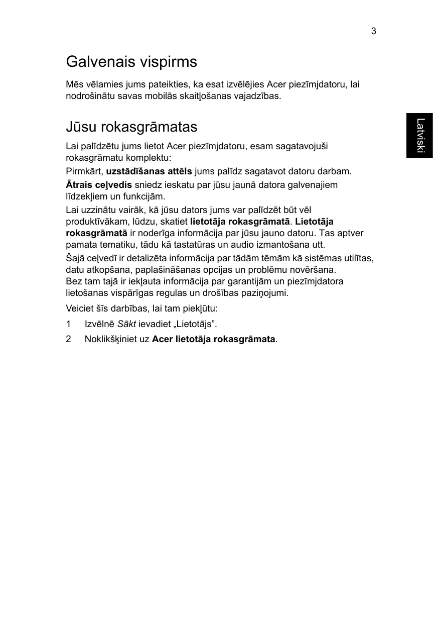 Mēs vēlamies jums pateikties, ka esat izvēljies Acer piezīmjdatoru, lai nodrošinātu savas mobilās skaitlošanas vajadžibas.