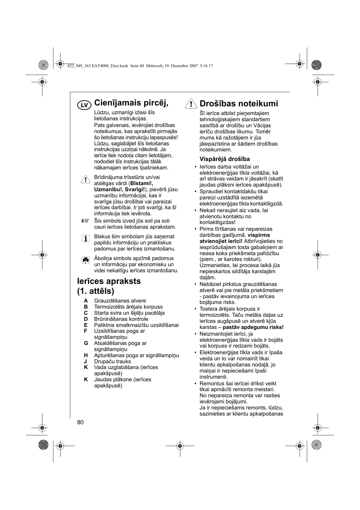 ! Brīdinājuma trīsstūris un/vaslēgas vārdi (Bīstamil, Uzmanību!, Svarīgi!), pievērš jusu uzmanību informācijai, kas ir svarīga jusu drośt Bai vai pareizai ierīces darbībai. Ir loti svartgi, ka šī informācija tiek ieverota.