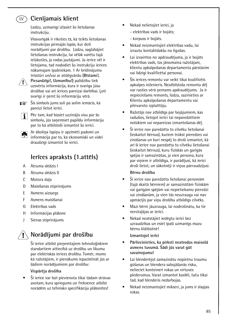 - Neturiet nevienu cietu prieksmetu (piem. karoti, nazi, putojamo) pret maisisanas ierici, kura darbojas, tapat nepieskarieties tai ar rokam. Nesmalcinet cietas sastavdalas, piem., riekstus, ledus gabalus ar blenderi. Sadi jus varat gut savainojumu!