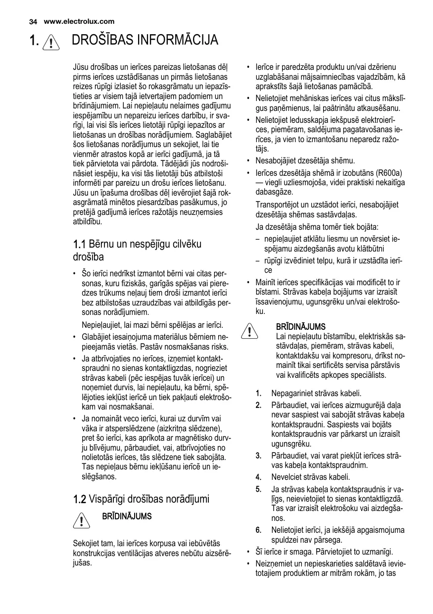 Ja atbrivojaties no ierie, iznemiet kontaktspraudni no sianas kontaktligdzas, nogrieziet stravas kabeli (pec iespejas tuvak ierieci) un nonemiet durvis, lai nepiəutu, ka berneni, spelëljoties ieklust ieriec un tink paklauti elektroso-kam vai nosmaksanai.