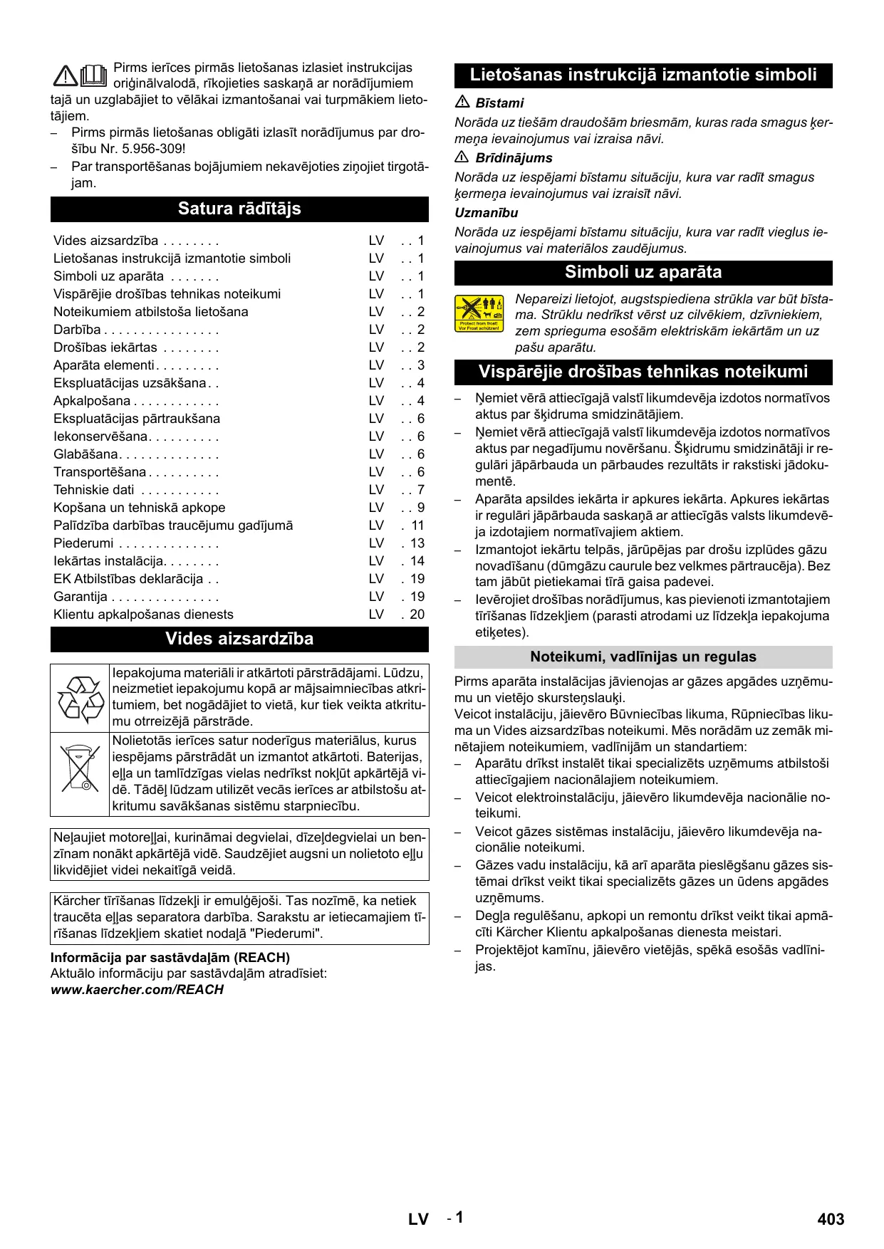 Vides aizsardzība Ņemiet vērā attiecīgajā valstī likumdevēja izdotos normatīvos aktus par šķidruma smidzinātājiem. Ņemiet vērā attiecīgajā valstī likumdevēja izdotos normatīvos aktus par negadījumu novēršanu. Šķidrumu smidzinātāji ir regulāri jāpārbauda un pārbaudes rezultāts ir rakstiski jādokumentē. Aparāta apsildes iekārta ir apkures iekārta. Apkures iekārtas ir regulāri jāpārbauda saskaņā ar attiecīgās valsts likumdevēja izdotajiem normatīvajiem aktiem. Izmantojot iekārtu telpās, jārūpējas par drošu izplūdes gāzu novadīšanu (dūmgāzu caurule bez velkmes pārtraucēja). Bez tam jābūt pietiekamai tīrā gaisa padevei. Ievērojiet drošības norādījumus, kas pievienoti izmantotajiem tīrīšanas līdzekļiem (parasti atrodami uz līdzekļa iepakojuma etiķetes). Noteikumi, vadlīnijas un regulas Iepakojuma materiāli ir atkārtoti pārstrādājami. Lūdzu, neizmetiet iepakojumu kopā ar mājsaimniecības atkritumiem, bet nogādājiet to vietā, kur tiek veikta atkritumu otrreizējā pārstrāde. Nolietotās ierīces satur noderīgus materiālus, kurus iespējams pārstrādāt un izmantot atkārtoti. Baterijas, eļļa un tamlīdzīgas vielas nedrīkst nokļūt apkārtējā vidē. Tādēļ lūdzam utilizēt vecās ierīces ar atbilstošu atkritumu savākšanas sistēmu starpniecību. Neļaujiet motoreļļai, kurināmai degvielai, dīzeļdegvielai un benzīnam nonākt apkārtējā vidē. Saudzējiet augsni un nolietoto eļļu likvidējiet videi nekaitīgā veidā. Kärcher tīrīšanas līdzekļi ir emulģējoši. Tas nozīmē, ka netiek traucēta eļļas separatora darbība. Sarakstu ar ietiecamajiem tīrīšanas līdzekļiem skatiet nodaļā "Piederumi". Informācija par sastāvdaļām (REACH) Aktuālo informāciju par sastāvdaļām atradīsiet: www.kaercher.com/REACH