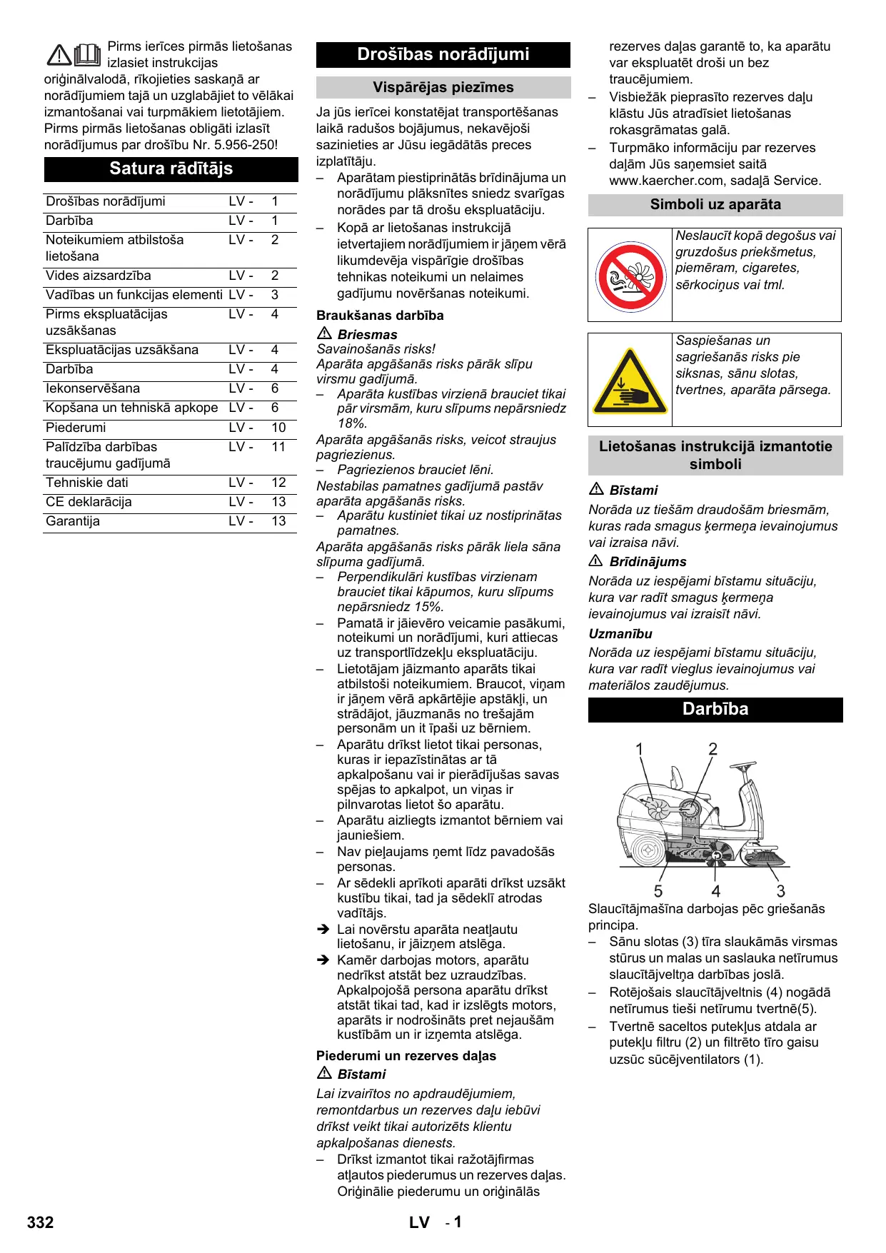 rezerves daļas garantē to, ka aparātu var ekspluatēt droši un bez traucējumiem. Visbiežāk pieprasīto rezerves daļu klāstu Jūs atradīsiet lietošanas rokasgrāmatas galā. Turpmāko informāciju par rezerves daļām Jūs saņemsiet saitā www.kaercher.com, sadaļā Service. Simboli uz aparāta Neslaucīt kopā degošus vai gruzdošus priekšmetus, piemēram, cigaretes, sērkociņus vai tml. Saspiešanas un sagriešanās risks pie siksnas, sānu slotas, tvertnes, aparāta pārsega. Lietošanas instrukcijā izmantotie simboli Bīstami Norāda uz tiešām draudošām briesmām, kuras rada smagus ķermeņa ievainojumus vai izraisa nāvi. 몇 Brīdinājums Norāda uz iespējami bīstamu situāciju, kura var radīt smagus ķermeņa ievainojumus vai izraisīt nāvi. Uzmanību Norāda uz iespējami bīstamu situāciju, kura var radīt vieglus ievainojumus vai materiālos zaudējumus. Darbība Slaucītājmašīna darbojas pēc griešanās principa. – Sānu slotas (3) tīra slaukāmās virsmas stūrus un malas un saslauka netīrumus slaucītājveltņa darbības joslā. – Rotējošais slaucītājveltnis (4) nogādā netīrumus tieši netīrumu tvertnē(5). – Tvertnē saceltos putekļus atdala ar putekļu filtru (2) un filtrēto tīro gaisu uzsūc sūcējventilators (1). Noteikumiem atbilstoša lietošana Izmantojiet šo slaucītājmašīnu tikai atbilstoši šajā instrukcijā ietvertajiem norādījumiem. Î Pirms lietošanas ir jāpārbauda aparāta un tā darba aprīkojuma pienācīgais stāvoklis un ekspluatācijas drošība. Ja to stāvoklis nav apmierinošs, tad ierīci izmantot nav atļauts. – Šī slaucītājmašīna ir domāta netīru iekštelpu un ārtelpu platību slaucīšanai. – Aparātu nav atļauts izmantot sabiedriskajā ceļu satiksmē. – Aparāts nav paredzēts veselībai bīstamu putekļu iesūkšanai. – Aparātu nedrīkst nekādā veidā pārveidot. – Nekad neuzsūciet/neieslauciet sprādzienbīstamus šķidrumus, degošas gāzes, kā arī neatšķaidītas skābes un šķīdinātājus! Pie tādiem attiecas benzīns, krāsas atšķaidītāji vai mazuts, kuri, sajaucoties ar iesūcamo gaisu, var veidot sprādzienbīstamus izgarojumus vai sajaukumus, bez tam arī acetons, neatšķaidītas skābes un šķīdinātāji, tā kā tie iedarbojas uz apparātā pielietotajiem materiāliem. – Neuzsūciet/nesaslauciet degošus vai kvēlojošus priekšmetus. – Aparāts paredzēts tikai lietošanas instrukcijā norādītajiem segumiem. – Aparātu ekspluatēt atļauts tikai uz tādām virsmām, kuras tīrīšanu ir atļāvis uzņēmējs vai tā pilnvarota persona. – Uzturēšanās bīstamā zonā ir aizliegta. Ierīces izmantošana sprādzienbīstamās telpās ir aizliegta. – Vispārēji attiecas: Viegli uzliesmojošas vielas turēt nostāk no aparāta (sprādziena/ugunsgrēka bīstamība). Vides aizsardzība Iepakojuma materiāli ir atkārtoti pārstrādājami. Lūdzu, neizmetiet iepakojumu kopā ar mājsaimniecības atkritumiem, bet nogādājiet to vietā, kur tiek veikta atkritumu otrreizējā pārstrāde. Nolietotās ierīces satur noderīgus materiālus, kurus iespējams pārstrādāt un izmantot atkārtoti. Baterijas, eļļa un tamlīdzīgas vielas nedrīkst nokļūt apkārtējā vidē. Tādēļ lūdzam utilizēt vecās ierīces ar atbilstošu atkritumu savākšanas sistēmu starpniecību. Informācija par sastāvdaļām (REACH) Aktuālo informāciju par sastāvdaļām atradīsiet: http://www.karcher.de/de/unternehmen/ umweltschutz/REACH.htm Piemēroti tīrīšanas segumi