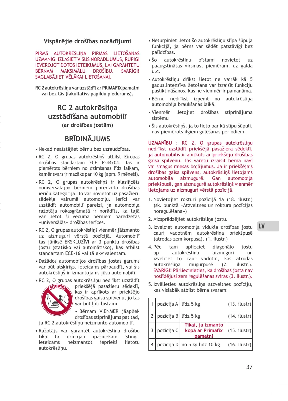 • Le siège auto RC 2 peut être installé sur le siège avant (dos à la route) après avoir désactivé l’airbag frontal ou bien à l’arrière de votre véhicule dos à la route. • Le siège auto RC 2 ne doit pas être installé à l’avant dans les véhicules équipés d’airbag frontal non déconnectables. • Utiliser le siège auto uniquement avec des ceintures de sécurité 3 points.