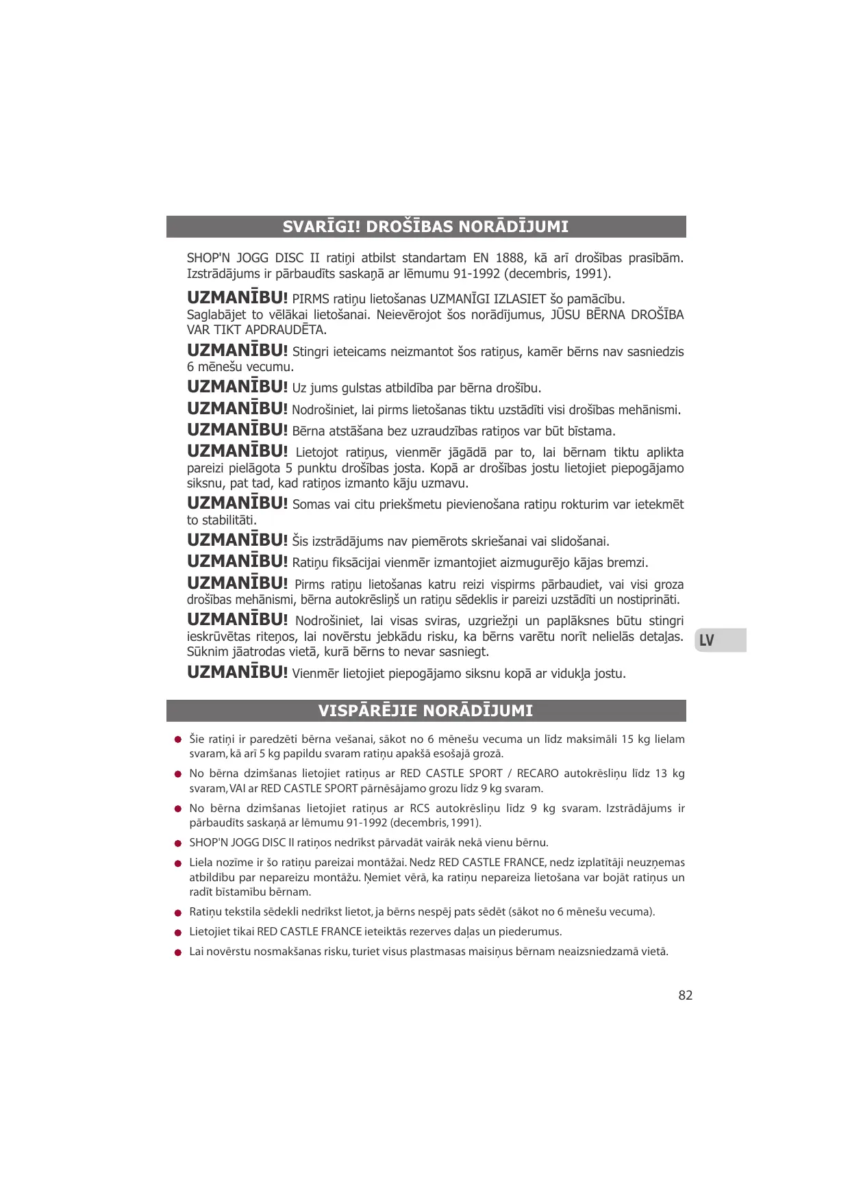 UZMANĪBU! Nodrošiniet, lai visas sviras, uzgriežņi un paplāksnes būtu stingri ieskrūvētas riteņos, lai novērstu jebkādu risku, ka bērns varētu norīt nelielās detaļas. Sūknim jāatrodas vietā, kurā bērns to nevar sasniegt. UZMANĪBU! Vienmēr lietojiet piepogājamo siksnu kopā ar vidukļa jostu. VISPĀRĒJIE NORĀDĪJUMI Šie ratiņi ir paredzēti bērna vešanai, sākot no 6 mēnešu vecuma un līdz maksimāli 15 kg lielam svaram, kā arī 5 kg papildu svaram ratiņu apakšā esošajā grozā. No bērna dzimšanas lietojiet ratiņus ar RED CASTLE SPORT / RECARO autokrēsliņu līdz 13 kg svaram, VAI ar RED CASTLE SPORT pārnēsājamo grozu līdz 9 kg svaram. No bērna dzimšanas lietojiet ratiņus ar RCS autokrēsliņu līdz 9 kg svaram. Izstrādājums ir pārbaudīts saskaņā ar lēmumu 91-1992 (decembris, 1991). SHOP'N JOGG DISC II ratiņos nedrīkst pārvadāt vairāk nekā vienu bērnu. Liela nozīme ir šo ratiņu pareizai montāžai. Nedz RED CASTLE FRANCE, nedz izplatītāji neuzņemas atbildību par nepareizu montāžu. Ņemiet vērā, ka ratiņu nepareiza lietošana var bojāt ratiņus un radīt bīstamību bērnam. Ratiņu tekstila sēdekli nedrīkst lietot, ja bērns nespēj pats sēdēt (sākot no 6 mēnešu vecuma). Lietojiet tikai RED CASTLE FRANCE ieteiktās rezerves daļas un piederumus. Lai novērstu nosmakšanas risku, turiet visus plastmasas maisiņus bērnam neaizsniedzamā vietā.