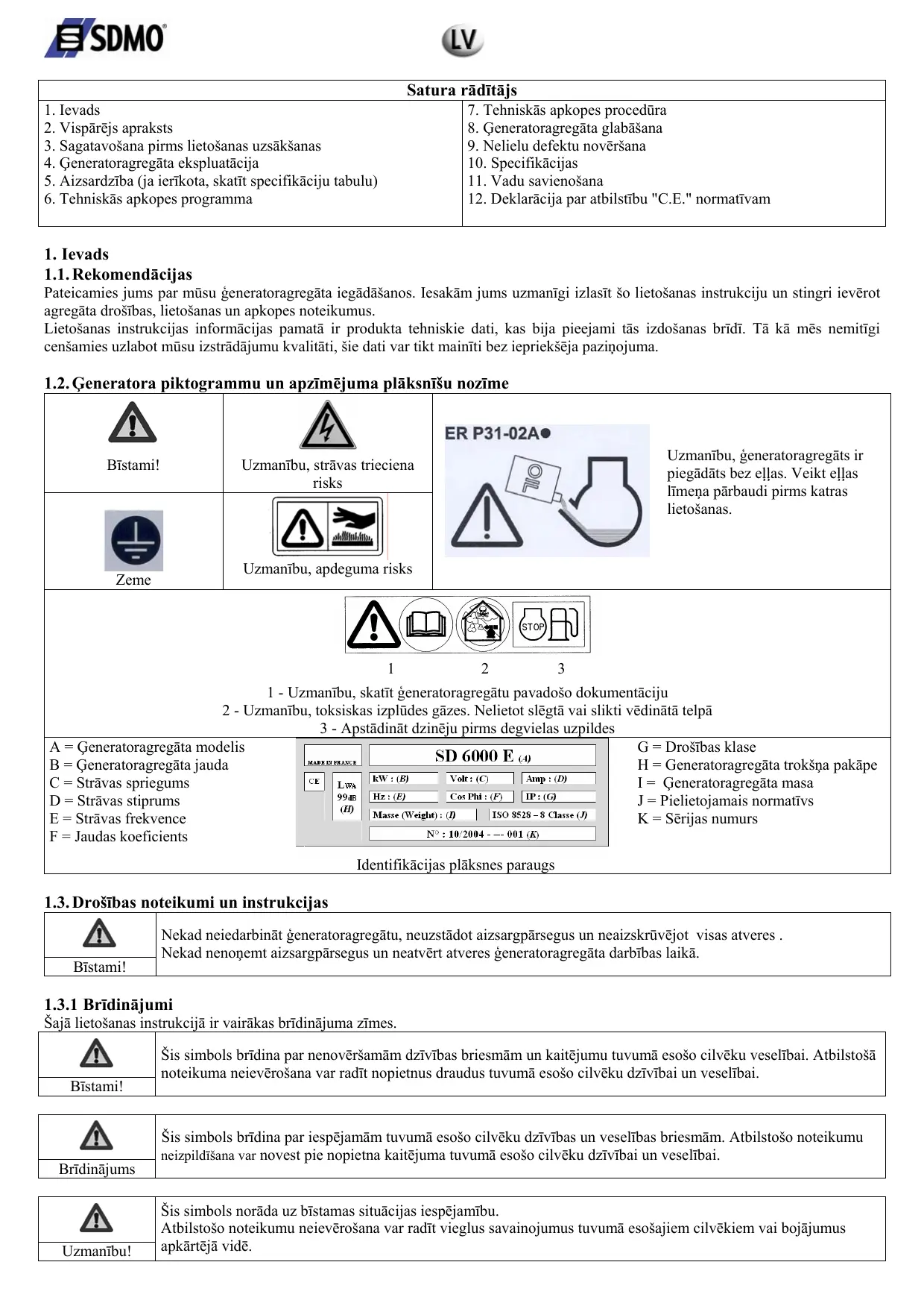 1.1. Rekomendācijas Pateicamies jums par mūsu ģeneratoragregāta iegādāšanos. Iesakām jums uzmanīgi izlasīt šo lietošanas instrukciju un stingri ievērot agregāta drošības, lietošanas un apkopes noteikumus. Lietošanas instrukcijas informācijas pamatā ir produkta tehniskie dati, kas bija pieejami tās izdošanas brīdī. Tā kā mēs nemitīgi cenšamies uzlabot mūsu izstrādājumu kvalitāti, šie dati var tikt mainīti bez iepriekšēja paziņojuma. 1.2. Ģeneratora piktogrammu un apzīmējuma plāksnīšu nozīme Bīstami! Uzmanību, ģeneratoragregāts ir piegādāts bez eļļas. Veikt eļļas līmeņa pārbaudi pirms katras lietošanas. Uzmanību, strāvas trieciena risks Uzmanību, apdeguma risks Zeme