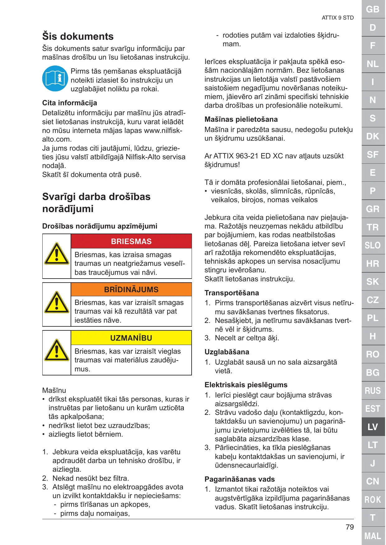 ATTIX 961-01 - Rūpnieciskais putekļsūcējs NILFISK - Notice d'utilisation et mode d'emploi gratuit