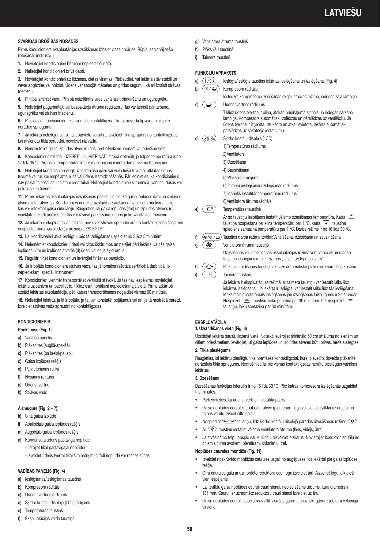c) Lamelles (à gauche / à droite) d) Grille sortie d’air e) Rouleaux f) Poignée de transport g) Réservoir d’eau h) Câble du secteur
