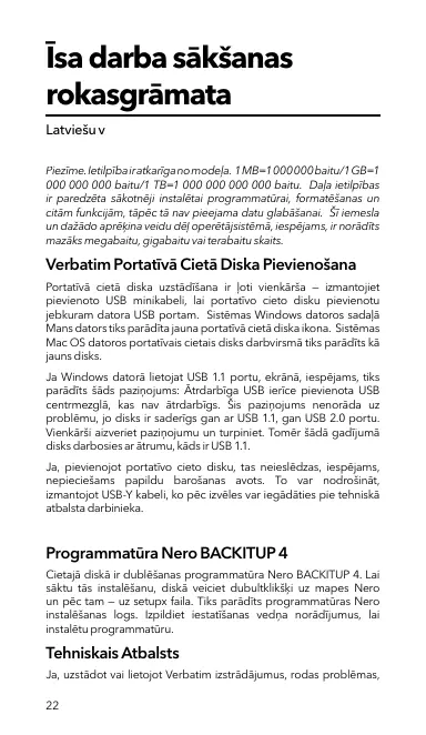 Īsa darba sākšanas rokasgrāmata Latviešu v Piezīme. Ietilpība ir atkarīga no modeļa. 1 MB=1 000 000 baitu/1 GB=1 000 000 000 baitu/1 TB=1 000 000 000 000 baitu. Daļa ietilpības ir paredzēta sākotnēji instalētai programmatūrai, formatēšanas un citām funkcijām, tāpēc tā nav pieejama datu glabāšanai. Šī iemesla un dažādo aprēķina veidu dēļ operētājsistēmā, iespējams, ir norādīts mazāks megabaitu, gigabaitu vai terabaitu skaits.