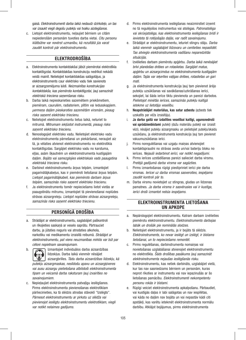 a. Strādājot ar elektroinstrumentu, saglabājiet paškontroli un rīkojieties saskaņā ar veselo saprātu. Pārtrauciet darbu, ja jūtaties noguris vai atrodaties alkohola, narkotiku vai medikamentu izraisītā reibumā. Strādājot ar elektroinstrumentu, pat viens neuzmanības mirklis var būt par cēloni nopietnam savainojumam. Izmantojiet individuālos darba aizsardzības b. līdzekļus. Darba laikā vienmēr nēsājiet aizsargbrilles. Tādu darba aizsardzības līdzekļu, kā putekļu aizsargmaskas, neslīdošu apavu un aizsargķiveres vai ausu aizsargu pielietošana atbilstoši elektroinstrumenta tipam un veicamā darba raksturam ļauj izvairīties no savainojumiem. c. Nepieļaujiet elektroinstrumenta patvaļīgu ieslēgšanos. Pirms elektroinstrumenta pievienošanas elektrotīklam pārliecinieties, ka tā slēdzis atrodas stāvoklī "Izslēgts". Pārnesot elektroinstrumentu ar pirkstu uz slēdža vai pievienojot ieslēgtu elektroinstrumentu elektrotīklam, viegli var notikt nelaimes gadījums. 105