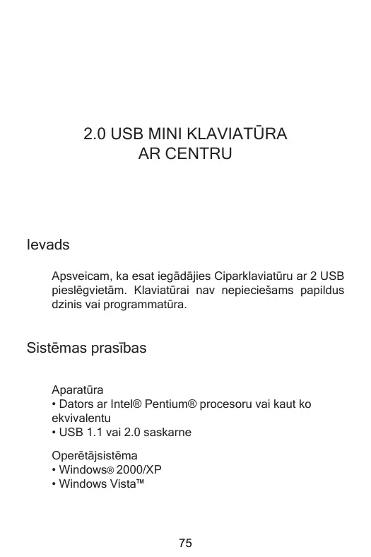 2.0 USB MINI KLAVIATŪRA AR CENTRU Ievads Apsveicam, ka esat iegādājies Ciparklaviatūru ar 2 USB pieslēgvietām. Klaviatūrai nav nepieciešams papildus dzinis vai programmatūra.