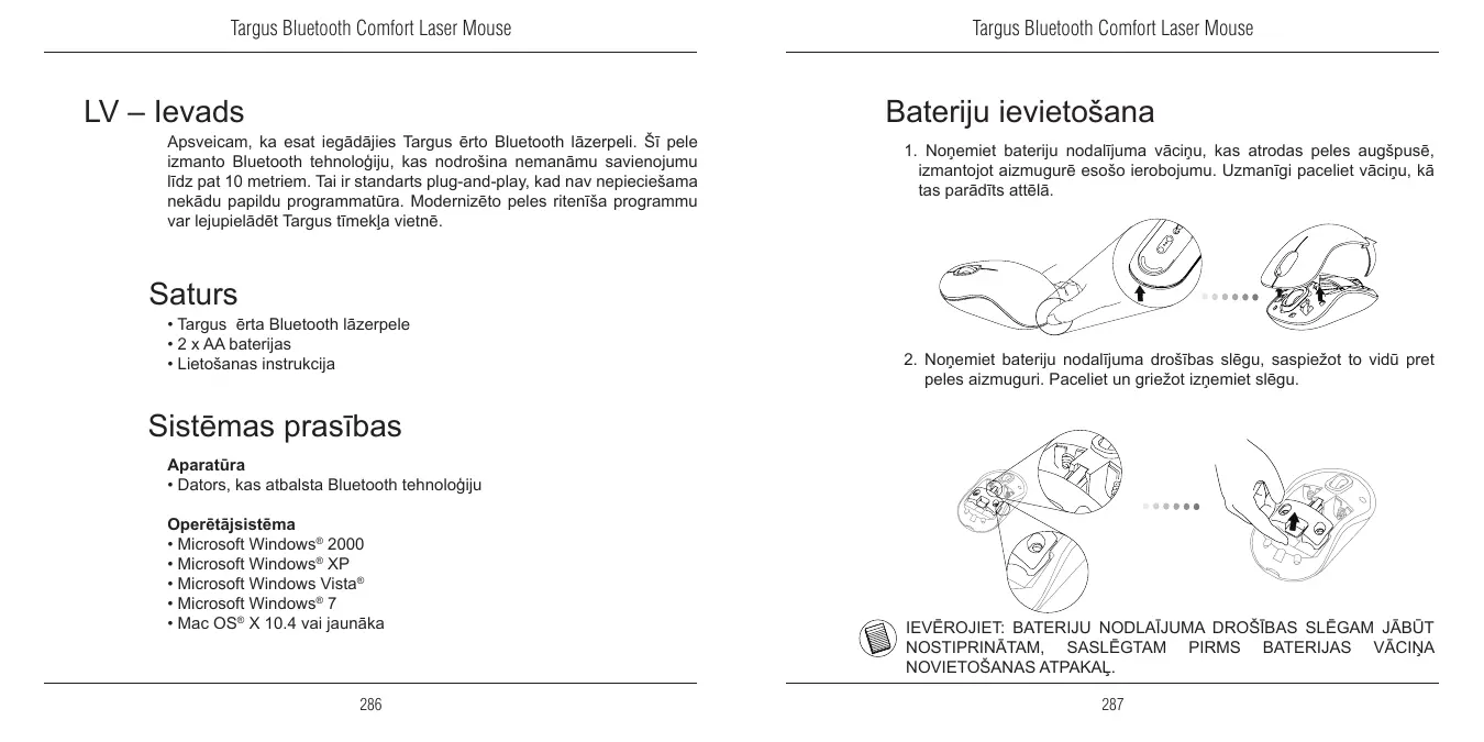 Apsveicam, ka esat iegādājies Targus ērto Bluetooth lāzerpeli. Šī pele izmanto Bluetooth tehnoloģiju, kas nodrošina nemanāmu savienojumu līdz pat 10 metriem. Tai ir standarts plug-and-play, kad nav nepieciešama nekādu papildu programmatūra. Modernizēto peles ritenīša programmu var lejupielādēt Targus tīmekļa vietnē.