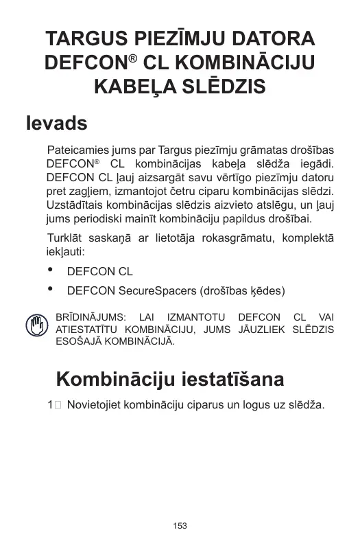TARGUS PIEZĪMJU DATORA DEFCON® CL KOMBINĀCIJU KABEĻA SLĒDZIS Ievads Pateicamies jums par Targus piezīmju grāmatas drošības DEFCON® CL kombinācijas kabeļa slēdža iegādi. DEFCON CL ļauj aizsargāt savu vērtīgo piezīmju datoru pret zagļiem, izmantojot četru ciparu kombinācijas slēdzi. Uzstādītais kombinācijas slēdzis aizvieto atslēgu, un ļauj jums periodiski mainīt kombināciju papildus drošībai. Turklāt saskaņā ar lietotāja rokasgrāmatu, komplektā iekļauti: