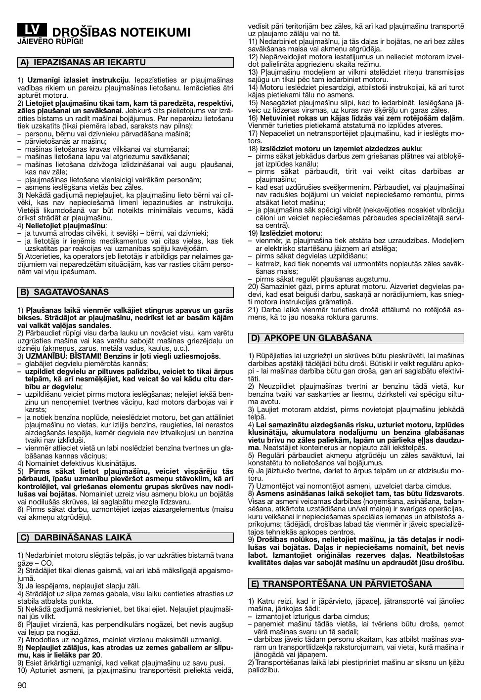 1) Toujours porter des chaussures résistantes et des pantalons longs pendant la tonte. Ne pas utiliser le matériel lorsque l’on est pieds nus ou en sandales. 2) Inspecter minutieusement toute la zone à tondre et éliminer tout objet étranger qui pourrait être projeté par la machine ou endommager l'ensemble de coupe et le moteur (pierres, morceaux de bois, fils de fer, os, etc..). 3) ATTENTION: DANGER! L’essence est hautement inflammable: – conserver le carburant dans des récipients spécialement prévus à cet effet; – faire le plein à l’aide d’un entonnoir, à l’extérieur uniquement et ne pas fumer pendant cette opération ou pendant toute manipulation de carburant; – ajouter de l’essence avant de démarrer le moteur et ne jamais enlever le bouchon du réservoir de carburant ou faire le plein lorsque le moteur est en fonctionnement ou tant qu’il est encore chaud; – ne pas démarrer le moteur si de l’essence a été répandue. Éloigner la tondeuse de la zone où le carburant a été renversé et ne provoquer aucune inflammation tant que le carburant ne s’est pas évaporé et que les vapeurs ne se sont pas dissipées; – remettre et serrer correctement les bouchons du réservoir et du récipient. 4) Remplacer les silencieux d’échappement défectueux. 5) Avant l’utilisation, toujours procéder à une vérification générale et en particulier de l’aspect des lames, des vis de fixation et de l’ensemble de coupe pour s’assurer qu’ils ne sont ni usés ni endommagés. Remplacer les lames et les vis endommagées ou usées par lots complets pour préserver le bon équilibrage. 6) Avant de commencer le travail, monter les protections (sac et déflecteur).