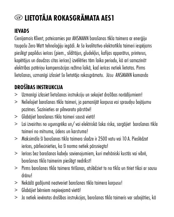 Informacija, esanti šiame vartotoju vadove gali būti keičiama be išankstinio perspėjimo. ANSMANN neatsako už tiesioginę, netiesioginę, netyčinę ar kitokią žalą naudojant šį prietaisą bei informaciją, esančią šiame vartotoju vadove. GARANTIJA Šiam produktui suteikiame 3 metų garantiją. Į ją neįeina gedimai, sukelti nesilaikant šio vartotojo vadovo nurodymų ar netinkamai eksploatuojant prietaisą. Techniniai duomenys gali būti keičiami be išankstinio perspėjimo. Už spaudos klaidas neatsakome. 05/2009 LV lietotāja rokasgrāmata AES1 IEVADS Cienījamais Klient, pateicamies par ANSMANN barošanas tīkla taimera ar enerģiju taupošu Zero Watt tehnoloģiju iegādi. Ar šo kvalitatīvo elektrotīkla taimeri iespējams pieslēgt papildus ierīces (piem., sildītājus, gludekļus, kafijas apparātus, printerus, kopētājus un daudzas citas ierīces) izvēlēties tām laika periodu, kā arī samazināt elektrības patēriņu kompensācijas režīma laikā, kad ierīces netiek lietotas. Pirms lietošanas, uzmanīgi izlasiet šo lietotāja rokasgrāmatu. Jūsu ANSMANN komanda