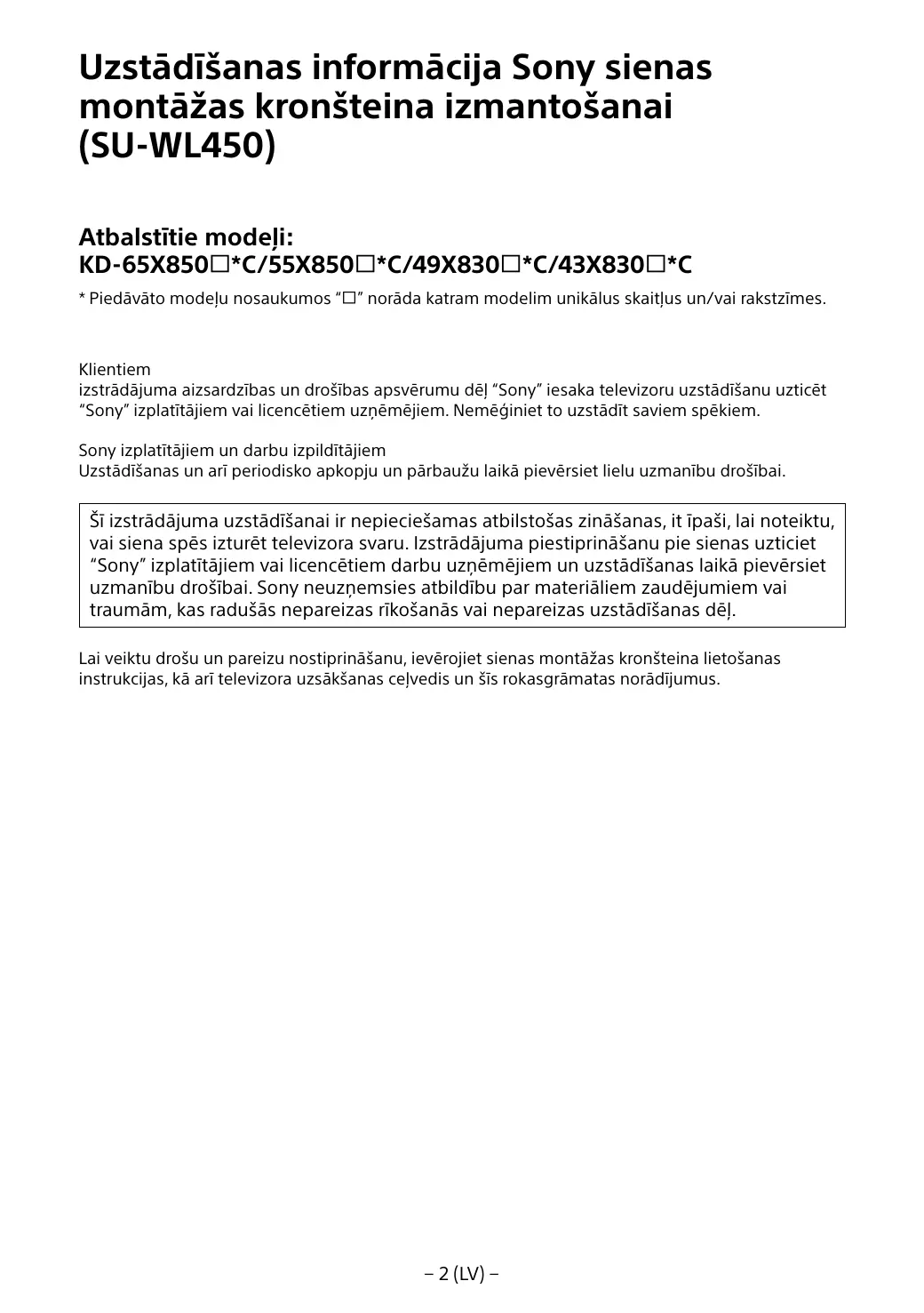 A l’attention des installateurs et revendeurs Sony Soyez particulièrement attentif à la sécurité pendant l’installation, l’entretien périodique et l’examen du produit.