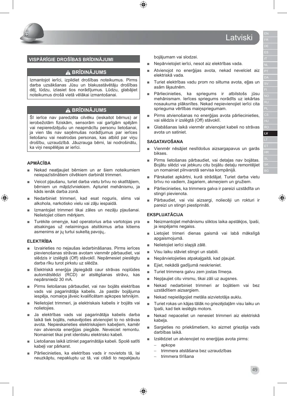 Trimmeris ir konstruēts zāles un nezāļu pļaušanai tikai personīgā dārzā. Ierīci nedrīkst izmantot publiskos dārzos, parkos, sporta centros un ceļa nomalēs, kā arī lauksaimniecībā un mežsaimniecībā. Trimmeri nedrīkst lietot dzīvžogu, krūmāju, krūmu, puķu un komposta griešanai un sasmalcināšanai. Pirms apkopes veikšanas vai gadījumā, ja kabelis ir bojāts vai sagriezts, nekavējoties atvienojiet kontaktdakšu no elektrotīkla. Sargieties no izmestiem vai lidojošiem priekšmetiem. Atturiet skatītājus drošā attālumā no mašīnas. Dubultā izolācija