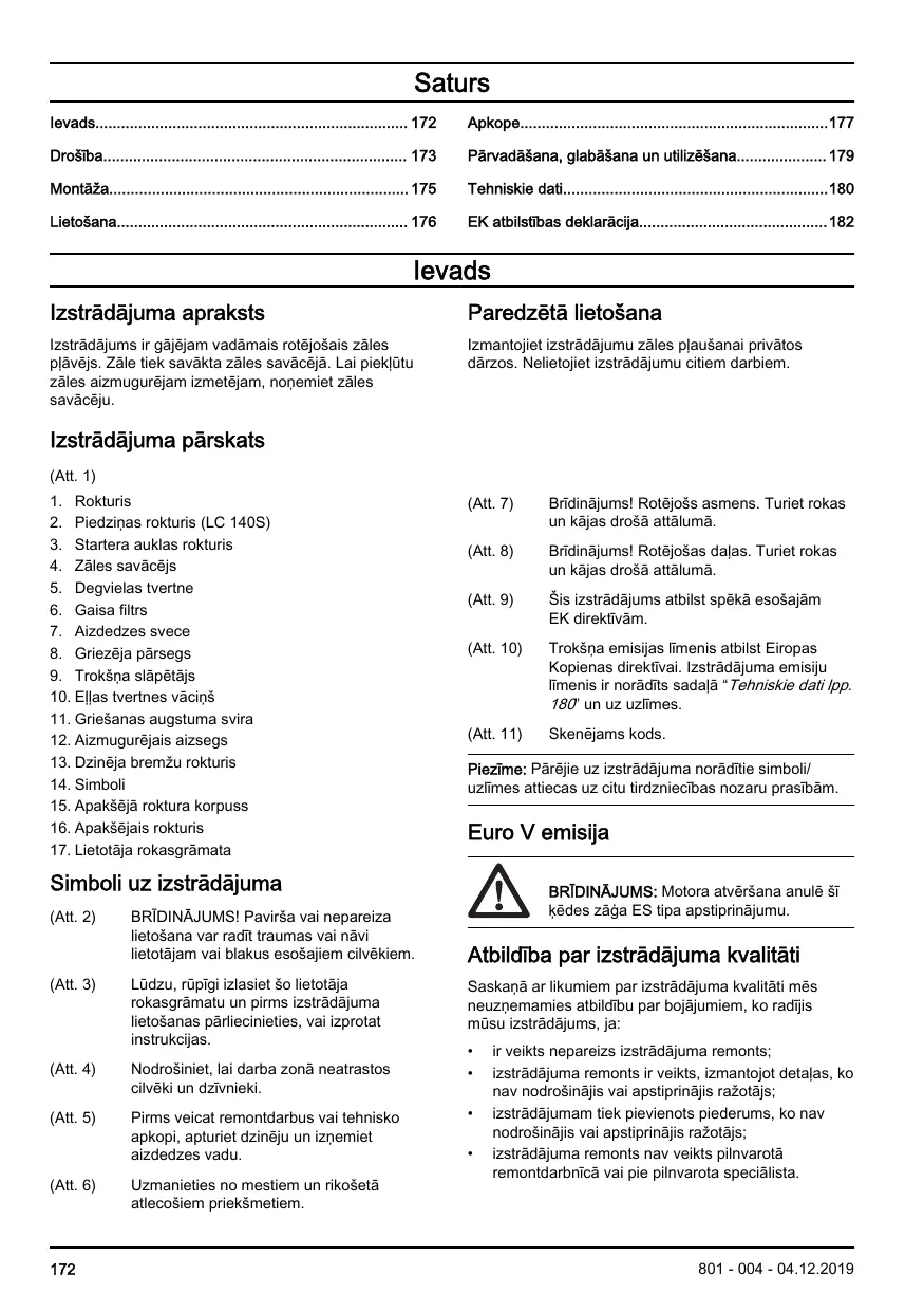 Izstrādājuma pārskats (Att. 1) 1. Rokturis 2. Piedziņas rokturis (LC 140S) 3. Startera auklas rokturis 4. Zāles savācējs 5. Degvielas tvertne 6. Gaisa filtrs 7. Aizdedzes svece 8. Griezēja pārsegs 9. Trokšņa slāpētājs 10. Eļļas tvertnes vāciņš 11. Griešanas augstuma svira 12. Aizmugurējais aizsegs 13. Dzinēja bremžu rokturis 14. Simboli 15. Apakšējā roktura korpuss 16. Apakšējais rokturis 17. Lietotāja rokasgrāmata