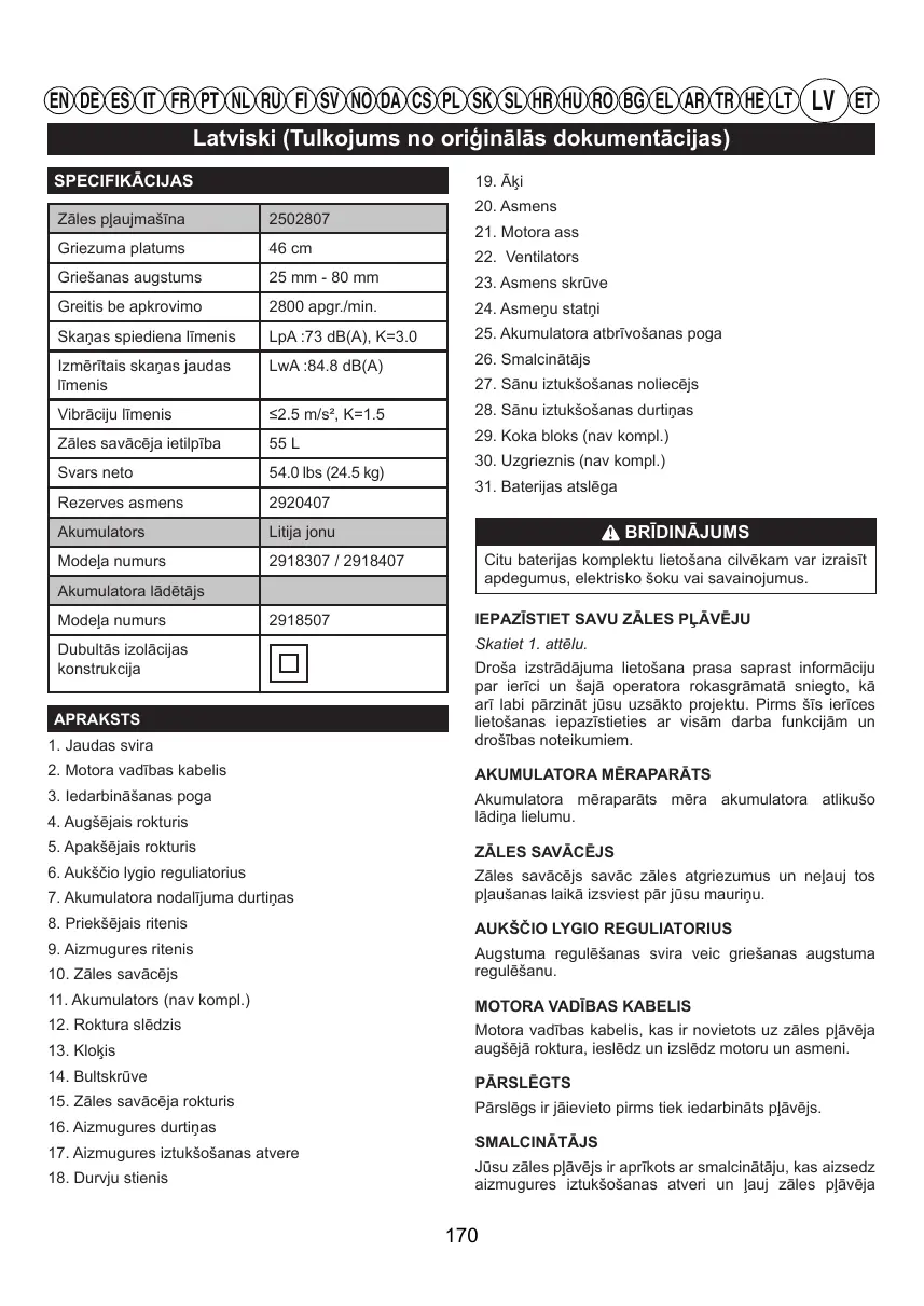Measured sound power level LWA: 84.8 dB(A) Guaranteed sound power level Año de fabricaciónVer etiqueta de • está en conformidad con las disposiciones pertinentes de la Directiva de maquinaria 2006/42/EC • está en conformidad con las disposiciones de estas otras Directivas-EC 2014/30/EU (Directiva EMC), y (2005/88/EC) EN 62233,EN ISO 3744; EN 55014-1; EN 55014-2, ISO 11094 Nivel de potencia acústica medido LWA: 84.8 dB (A) Nivel de potencia acústica garantizado 88 dB (A) EN 55014-2, ISO 11094 Livello di potenza sonora misurata LWA: 84.8 dB(A) Livello di potenza sonora garantita Année de fabrication Voir plaque signalétique du produit • est conforme aux réserves applicables de la Directive Machinerie (2006/42/EC) • est conforme aux réserves applicables des autres Directives CE suivantes 2014/30/EU (Directive EMC), et (2005/88/CE) 2000/14/CE (Directive Émissions Sonores) y-compris Nous déclarons par ailleurs que • les parties suivantes (parties/clauses des) standards Européens harmonisés ont été utilisées EN 60335-1, EN60335-2-77; EN 62233,EN ISO 3744; EN 55014-1; EN 55014-2, ISO 11094 Niveau de puissance sonore mesuré LWA : 84.8 dB(A) Niveau de puissance sonore garanti 88 dB(A) Méthode d'évaluation de conformité de l'annexe V/Directive 2000/14/CE Approbation de type EC 2000/14/EC : Intertek Testing & Certification EN 60335-1, EN60335-2-77; EN 62233,EN ISO 3744; EN 55014-1; EN 55014-2, ISO 11094 Gemeten geluidsdrukniveau LWA: 84.8 dB(A) Gegarandeerd geluidsdrukniveau EN 55014-2, ISO 11094 Nível de potência sonora medido LWA: 84.8 dB(A) Nível de potência sonora garantido 88 dB(A) Método de avaliação de conformidade para o anexo V/ Directiva 2000/14/EC Tipo de aprovação CE para 2000/14/CE: Intertek Testing & Certification Co., EN 55014-2, ISO 11094 88