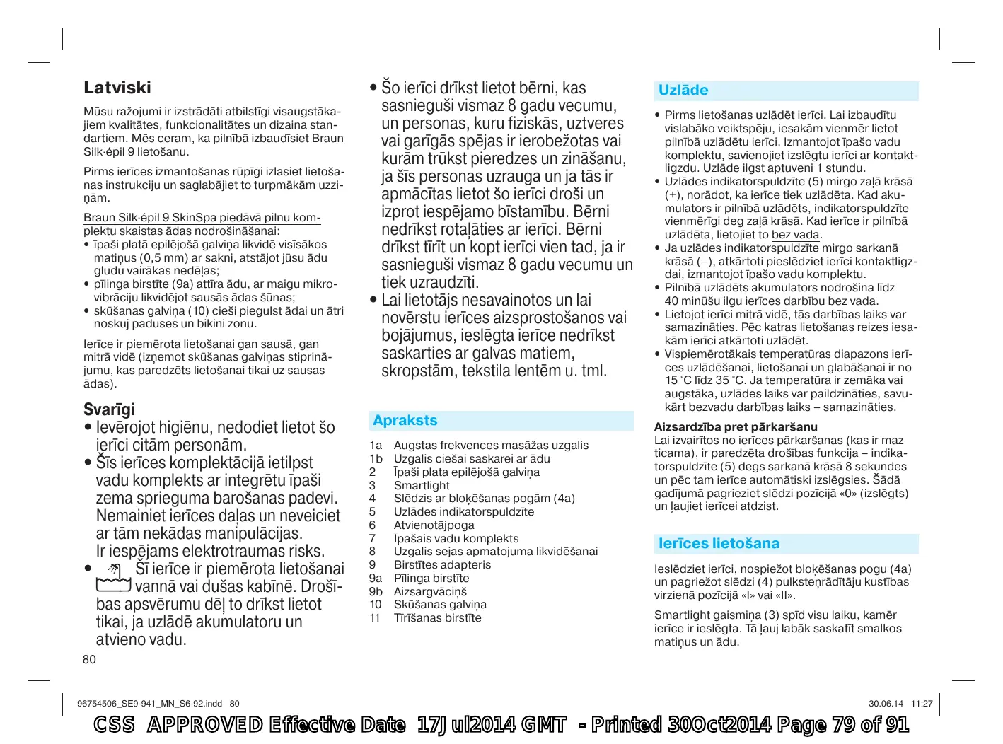 CSS APPROVED Effective Date 17Jul2014 GMT - Printed 30Oct2014 Page 78 of 91 Latviski Mūsu ražojumi ir izstrādāti atbilstīgi visaugstākajiem kvalitātes, funkcionalitātes un dizaina standartiem. Mēs ceram, ka pilnībā izbaudīsiet Braun Silk·épil 9 lietošanu. Pirms ierīces izmantošanas rūpīgi izlasiet lietošanas instrukciju un saglabājiet to turpmākām uzziņām. Braun Silk·épil 9 SkinSpa piedāvā pilnu komplektu skaistas ādas nodrošināšanai: