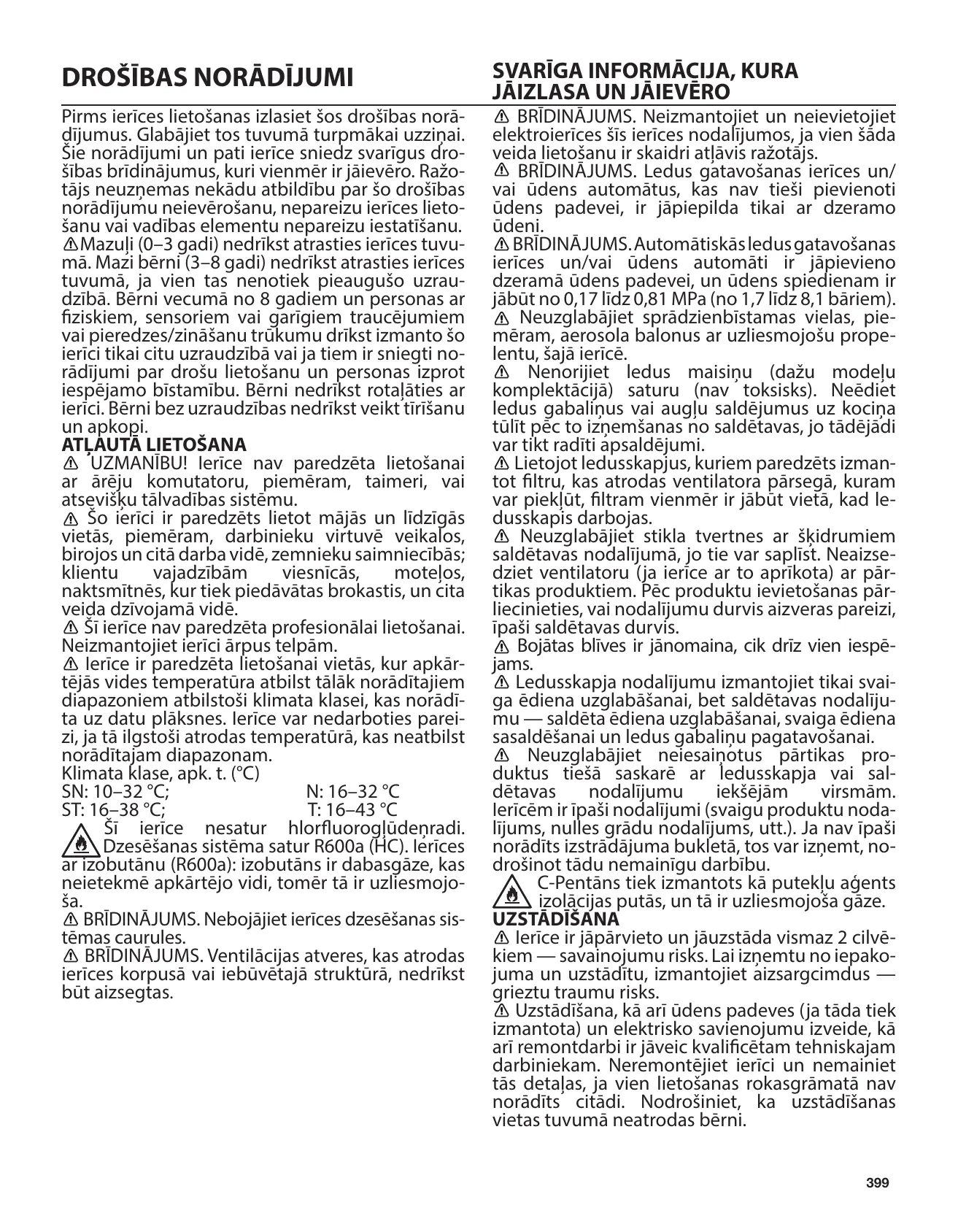 SN : De 10 à 32 °C; N : De 16 à 32 °C ST : De 16 à 38 °C; T : De 16 à 43 °C Cet appareil ne contient pas de CFC. Le circuit de ce réfrigérateur contient du R600a (HC).
