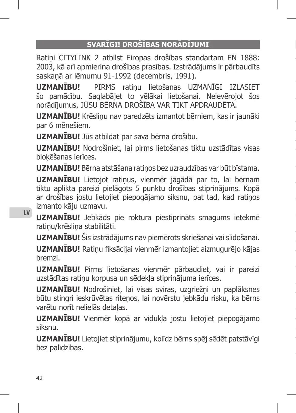 LT SVARĪGI! DROŠĪBAS NORĀDĪJUMI Ratiņi CITYLINK 2 atbilst Eiropas drošības standartam EN 1888: 2003, kā arī apmierina drošības prasības. Izstrādājums ir pārbaudīts saskaņā ar lēmumu 91-1992 (decembris, 1991). UZMANĪBU! PIRMS ratiņu lietošanas UZMANĪGI IZLASIET šo pamācību. Saglabājet to vēlākai lietošanai. Neievērojot šos norādījumus, JŪSU BĒRNA DROŠĪBA VAR TIKT APDRAUDĒTA. UZMANĪBU! Krēsliņu nav paredzēts izmantot bērniem, kas ir jaunāki par 6 mēnešiem. UZMANĪBU! Jūs atbildat par sava bērna drošību. UZMANĪBU! Nodrošiniet, lai pirms lietošanas tiktu uzstādītas visas bloķēšanas ierīces. UZMANĪBU! Bērna atstāšana ratiņos bez uzraudzības var būt bīstama. UZMANĪBU! Lietojot ratiņus, vienmēr jāgādā par to, lai bērnam tiktu aplikta pareizi pielāgots 5 punktu drošības stiprinājums. Kopā ar drošības jostu lietojiet piepogājamo siksnu, pat tad, kad ratiņos izmanto kāju uzmavu. LV UZMANĪBU! Jebkāds pie roktura piestiprināts smagums ietekmē ratiņu/krēsliņa stabilitāti. UZMANĪBU! Šis izstrādājums nav piemērots skriešanai vai slidošanai. UZMANĪBU! Ratiņu fiksācijai vienmēr izmantojiet aizmugurējo kājas bremzi. UZMANĪBU! Pirms lietošanas vienmēr pārbaudiet, vai ir pareizi uzstādītas ratiņu korpusa un sēdekļa stiprinājuma ierīces. UZMANĪBU! Nodrošiniet, lai visas sviras, uzgriežņi un paplāksnes būtu stingri ieskrūvētas riteņos, lai novērstu jebkādu risku, ka bērns varētu norīt nelielās detaļas. UZMANĪBU! Vienmēr kopā ar vidukļa jostu lietojiet piepogājamo siksnu. UZMANĪBU! Lietojiet stiprinājumu, kolīdz bērns spēj sēdēt patstāvīgi bez palīdzības.