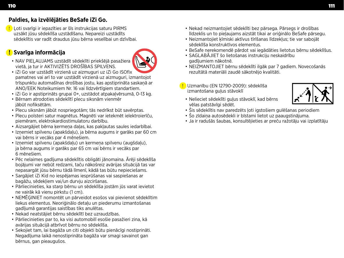 Paldies, ka izvēlējāties BeSafe iZi Go. !! Ļoti svarīgi ir iepazīties ar šīs instrukcijas saturu PIRMS uzsākt jūsu sēdeklīša uzstādīšanu. Nepareizi uzstādīts sēdeklītis var radīt draudus jūsu bērna veselībai un dzīvībai.