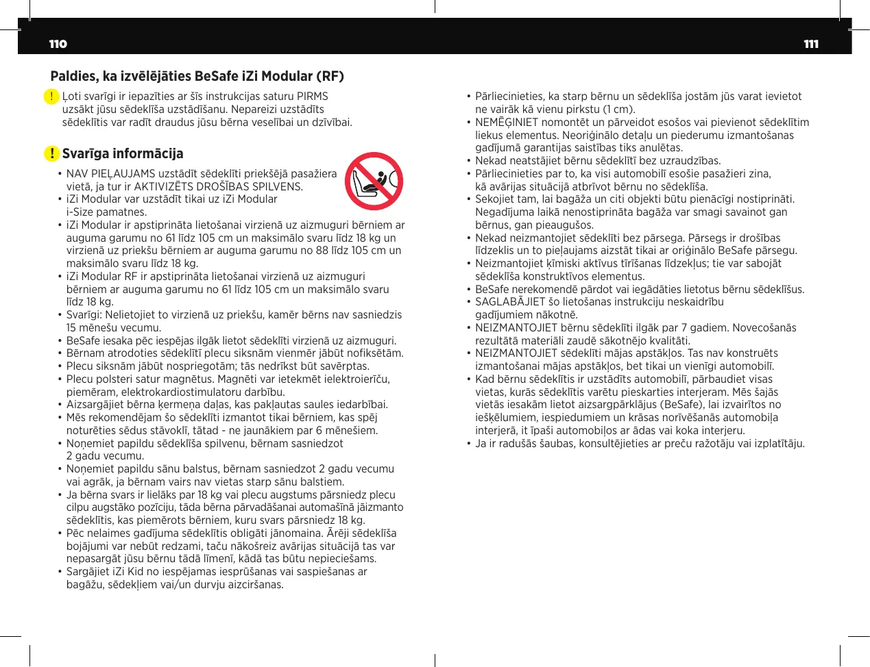 !! Svarīga informācija • NAV PIEĻAUJAMS uzstādīt sēdeklīti priekšējā pasažiera vietā, ja tur ir AKTIVIZĒTS DROŠĪBAS SPILVENS. • iZi Modular var uzstādīt tikai uz iZi Modular i-Size pamatnes. • iZi Modular ir apstiprināta lietošanai virzienā uz aizmuguri bērniem ar auguma garumu no 61 līdz 105 cm un maksimālo svaru līdz 18 kg un virzienā uz priekšu bērniem ar auguma garumu no 88 līdz 105 cm un maksimālo svaru līdz 18 kg. • iZi Modular RF ir apstiprināta lietošanai virzienā uz aizmuguri bērniem ar auguma garumu no 61 līdz 105 cm un maksimālo svaru līdz 18 kg. • Svarīgi: Nelietojiet to virzienā uz priekšu, kamēr bērns nav sasniedzis 15 mēnešu vecumu. • BeSafe iesaka pēc iespējas ilgāk lietot sēdeklīti virzienā uz aizmuguri. • Bērnam atrodoties sēdeklītī plecu siksnām vienmēr jābūt nofiksētām. • Plecu siksnām jābūt nospriegotām; tās nedrīkst būt savērptas. • Plecu polsteri satur magnētus. Magnēti var ietekmēt ielektroierīču, piemēram, elektrokardiostimulatoru darbību. • Aizsargājiet bērna ķermeņa daļas, kas pakļautas saules iedarbībai. • Mēs rekomendējam šo sēdeklīti izmantot tikai bērniem, kas spēj noturēties sēdus stāvoklī, tātad - ne jaunākiem par 6 mēnešiem. • Noņemiet papildu sēdeklīša spilvenu, bērnam sasniedzot 2 gadu vecumu. • Noņemiet papildu sānu balstus, bērnam sasniedzot 2 gadu vecumu vai agrāk, ja bērnam vairs nav vietas starp sānu balstiem. • Ja bērna svars ir lielāks par 18 kg vai plecu augstums pārsniedz plecu cilpu augstāko pozīciju, tāda bērna pārvadāšanai automašīnā jāizmanto sēdeklītis, kas piemērots bērniem, kuru svars pārsniedz 18 kg. • Pēc nelaimes gadījuma sēdeklītis obligāti jānomaina. Ārēji sēdeklīša bojājumi var nebūt redzami, taču nākošreiz avārijas situācijā tas var nepasargāt jūsu bērnu tādā līmenī, kādā tas būtu nepieciešams. • Sargājiet iZi Kid no iespējamas iesprūšanas vai saspiešanas ar bagāžu, sēdekļiem vai/un durvju aizciršanas.