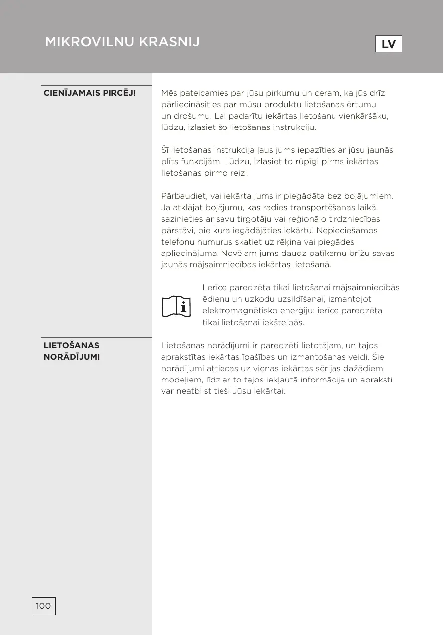 Mēs pateicamies par jūsu pirkumu un ceram, ka jūs drīz pārliecināsities par mūsu produktu lietošanas ērtumu un drošumu. Lai padarītu iekārtas lietošanu vienkāršāku, lūdzu, izlasiet šo lietošanas instrukciju. Šī lietošanas instrukcija ļaus jums iepazīties ar jūsu jaunās plīts funkcijām. Lūdzu, izlasiet to rūpīgi pirms iekārtas lietošanas pirmo reizi. Pārbaudiet, vai iekārta jums ir piegādāta bez bojājumiem. Ja atklājat bojājumu, kas radies transportēšanas laikā, sazinieties ar savu tirgotāju vai reģionālo tirdzniecības pārstāvi, pie kura iegādājāties iekārtu. Nepieciešamos telefonu numurus skatiet uz rēķina vai piegādes apliecinājuma. Novēlam jums daudz patīkamu brīžu savas jaunās mājsaimniecības iekārtas lietošanā. Lerīce paredzēta tikai lietošanai mājsaimniecībās ēdienu un uzkodu uzsildīšanai, izmantojot elektromagnētisko enerģiju; ierīce paredzēta tikai lietošanai iekštelpās. LIETOŠANAS