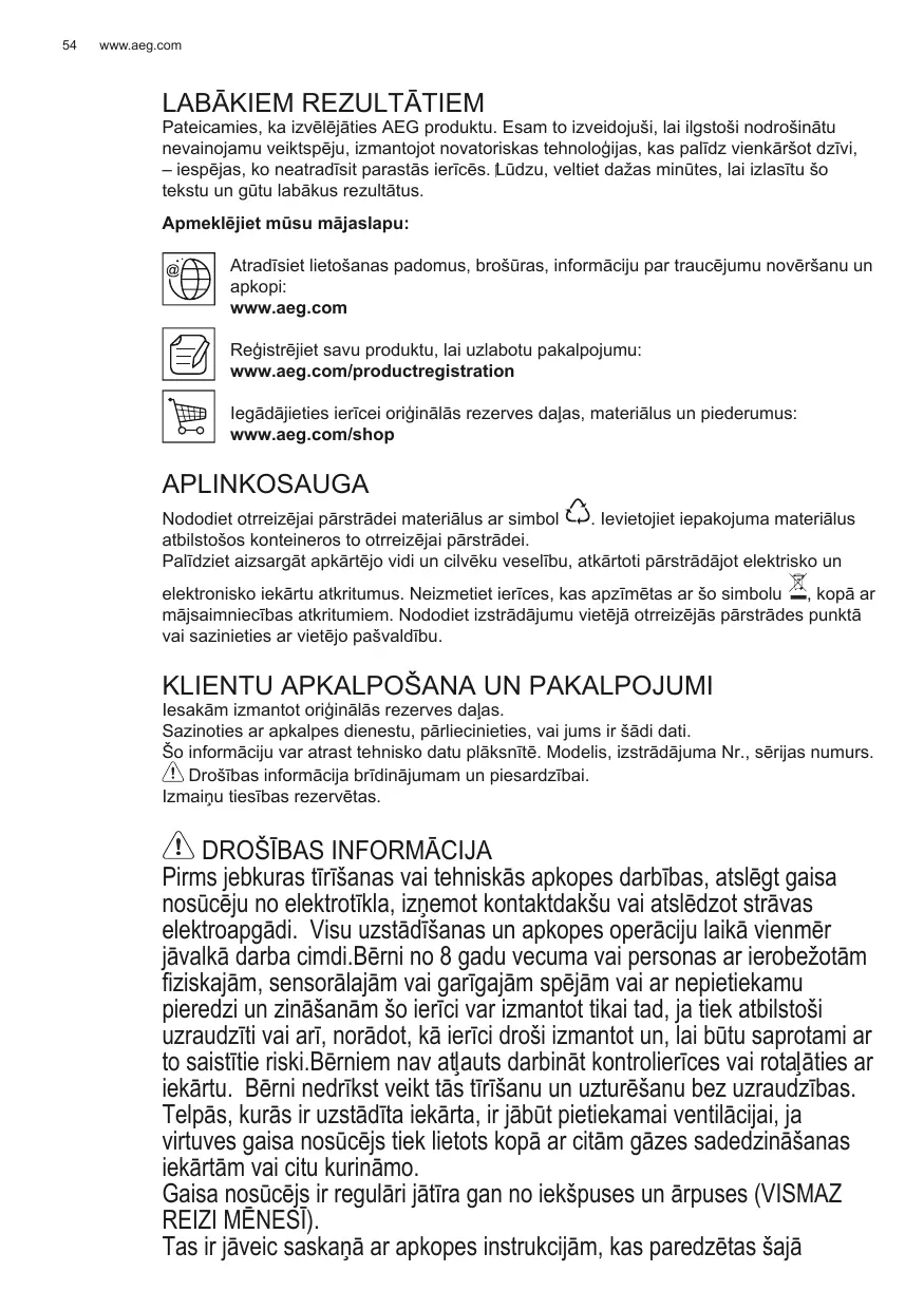 Pateicamies, ka izvēlējāties AEG produktu. Esam to izveidojuši, lai ilgstoši nodrošinātu nevainojamu veiktspēju, izmantojot novatoriskas tehnoloģijas, kas palīdz vienkāršot dzīvi, – iespējas, ko neatradīsit parastās ierīcēs. Lūdzu, veltiet dažas minūtes, lai izlasītu šo tekstu un gūtu labākus rezultātus. Apmeklējiet mūsu mājaslapu: Atradīsiet lietošanas padomus, brošūras, informāciju par traucējumu novēršanu un apkopi: www.aeg.com Reģistrējiet savu produktu, lai uzlabotu pakalpojumu: www.aeg.com/productregistration Iegādājieties ierīcei oriģinālās rezerves daļas, materiālus un piederumus: www.aeg.com/shop APLINKOSAUGA Nododiet otrreizējai pārstrādei materiālus ar simbol . Ievietojiet iepakojuma materiālus atbilstošos konteineros to otrreizējai pārstrādei. Palīdziet aizsargāt apkārtējo vidi un cilvēku veselību, atkārtoti pārstrādājot elektrisko un elektronisko iekārtu atkritumus. Neizmetiet ierīces, kas apzīmētas ar šo simbolu , kopā ar mājsaimniecības atkritumiem. Nododiet izstrādājumu vietējā otrreizējās pārstrādes punktā vai sazinieties ar vietējo pašvaldību.