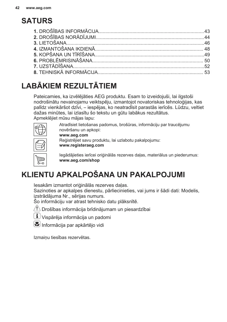SATURS 1. DROŠĪBAS INFORMĀCIJA43 2. DROŠĪBAS NORĀDĪJUMI44 3. LIETOŠANA46 4. IZMANTOŠANA IKDIENĀ 48 5. KOPŠANA UN TĪRĪŠANA49 6. PROBLĒMRISINĀŠANA 50 7. UZSTĀDĪŠANA52 8. TEHNISKĀ INFORMĀCIJA 53