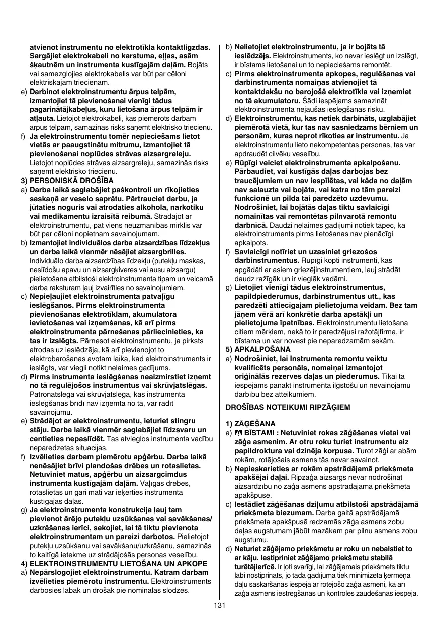 2) SECURITE RELATIVE AU SYSTEME ELECTRIQUE a) La fiche de secteur de l’outil électroportatif doit être appropriée à la prise de courant. Ne modifiez en aucun cas la fiche. N’utilisez pas de fiches d’adaptateur avec des appareils avec mise à la terre. Les fiches non modifiées et les prises de courant appropriées réduisent le risque de choc électrique. b) Evitez le contact physique avec des surfaces mises à la terre telles que tuyaux, radiateurs, fours et réfrigérateurs. Il y a un risque élevé de choc électrique au cas où votre corps serait relié à la terre. c) N’exposez pas l’outil électroportatif à la pluie ou à l’humidité. La pénétration d’eau dans un outil électroportatif augmente le risque d’un choc électrique. d) N’utilisez pas le câble à d’autres fins que celles prévues, n’utilisez pas le câble pour porter l’appareil ou pour l’accrocher ou encore pour le débrancher de la prise de courant. Maintenez le câble éloigné des sources de chaleur, des parties grasses, des bords tranchants ou des parties de l’appareil en rotation. Un câble endommagé ou torsadé augmente le risque d’un choc électrique. e) Au cas où vous utiliseriez l’outil électroportatif à l’extérieur, utilisez une rallonge autorisée homologuée pour les applications extérieures. L’utilisation d’une rallonge électrique homologuée pour les applications extérieures réduit le risque d’un choc électrique. f) Si l’usage d’un outil dans un emplacement humide est inévitable, utilisez un disjoncteur de fuite à la terre. L’utilisation d’un disjoncteur de fuite à la terre réduit le risque de choc électrique. 3) SECURITE DES PERSONNES a) Restez vigilant, surveillez ce que vous faites. Faites preuve de bon sens en utilisant l’outil électroportatif. N’utilisez pas l’appareil lorsque vous êtes fatigué ou après avoir consommé de l’alcool, des drogues ou avoir pris des médicaments. Un moment d’inattention lors de l’utilisation de l’appareil peut entraîner de graves blessures sur les personnes.