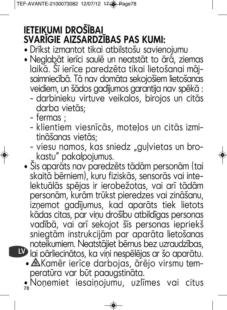 Téléchargez la notice de votre Gatavošanas ierīce au format PDF gratuitement ! Retrouvez votre notice WM756D12 - TEFAL et reprennez votre appareil électronique en main. Sur cette page sont publiés tous les documents nécessaires à l'utilisation de votre appareil WM756D12 de la marque TEFAL.