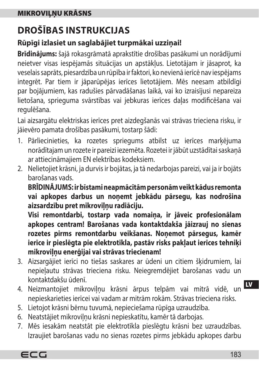 vai garīgās spējas vai trūkst pieredzes un zināšanu, ja tiem tiek nodrošināta uzraudzība vai ir sniegtas instrukcijas par ierīces drošu lietošanu un tie saprot iespējamās briesmas. Bērni nedrīkst ar ierīci spēlēties. Bērni nedrīkst veikt ierīces tīrīšanu un apkopi, ja vien tie nav vismaz 8 gadus veci un nav nodrošināta uzraudzība. Nepakļaujiet sevi pārmērīgai mikroviļņu enerģijas iedarbībai