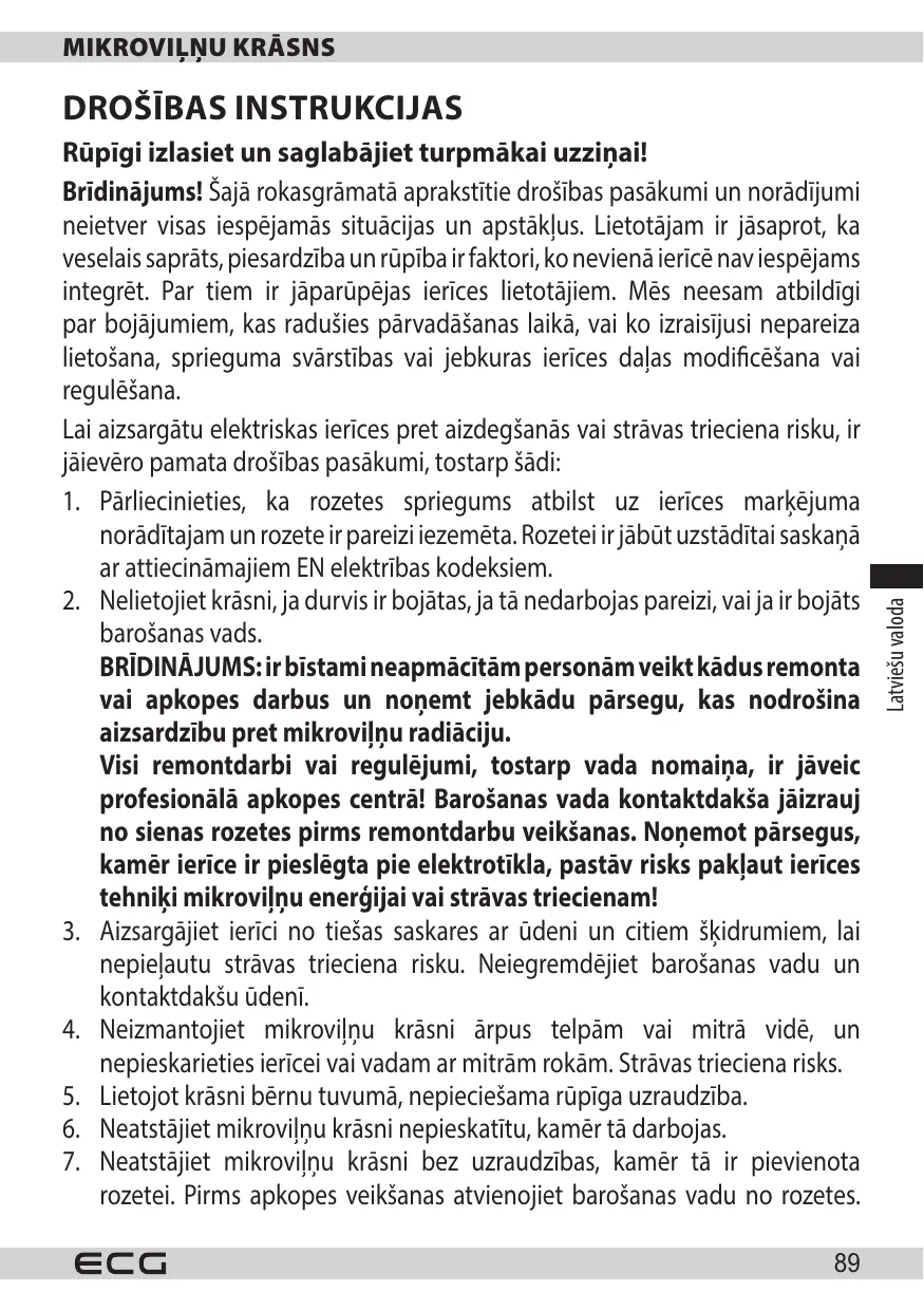Izmantojiet mikrovilnju krasni tikai saskaanar saja rokasgramata sniegtajam instrukcijam. Mikrovilnu krasns ir paredzeta tikai majas lietoisanai. Ražotajs nav atbildigs par bojajumiem, kas radusies, ierici lietojot neatbilstoşi.