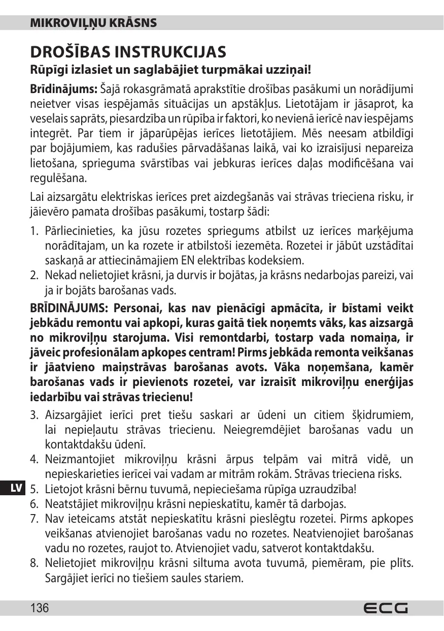 20.Mikrovilnku krasns ir paredzeta edenu un dzerienu sildisanai. Zavejot edenu vai apgerbus un spilvenus, cibas, suklus, slapju audumu un tamlidzigus prieksmetus, iespejams izraisit traumas, spradzenu vai aizdegsanos. -