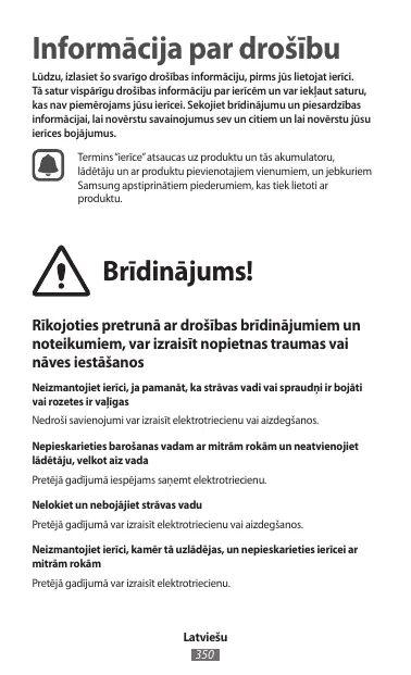 N’utilisez pas votre appareil en extérieur pendant un orage Vous risquez de vous électrocuter ou de provoquer un dysfonctionnement de l’appareil. Utilisez des batteries, des chargeurs, des accessoires et des fournitures homologué(e)s • L’utilisation d’une batterie ou d’un chargeur générique peut réduire la durée de vie de votre appareil ou provoquer des dysfonctionnements. Cela peut également entraîner un incendie ou une explosion de la batterie. • Utilisez exclusivement une batterie et un chargeur homologués par Samsung et spécialement conçus pour l’appareil. L’utilisation d’une batterie et d’un chargeur incompatibles peut provoquer des blessures graves ou endommager votre appareil. • Samsung ne peut être tenu responsable de la sécurité de l’utilisateur si celui-ci utilise des accessoires ou des éléments non homologués par Samsung. Ne placez pas l’appareil dans vos poches arrières ou à la ceinture • En cas de pression excessive appliquée sur l’appareil, celui-ci risque d’être endommagé, d’exploser ou de provoquer un incendie. • Vous pourriez également être blessé(e) en cas de choc ou de chute. Ne laissez pas tomber le chargeur ou l’appareil et ne l’exposez pas aux chocs Manipulez l’appareil et le chargeur avec précaution, même lorsque vous devez vous en séparer • Ne jetez jamais la batterie ou l’appareil au feu. Ne posez jamais la batterie ou l’appareil à l’intérieur ou au-dessus d’appareils chauffants, tels que des fours à micro-ondes, des cuisinières ou des radiateurs. En cas de surchauffe, ils risquent d’exploser. Respectez la réglementation en vigueur dans votre pays concernant la mise au rebut des batteries ou des appareils usagé(e)s. • N’écrasez ou ne perforez jamais l’appareil.
