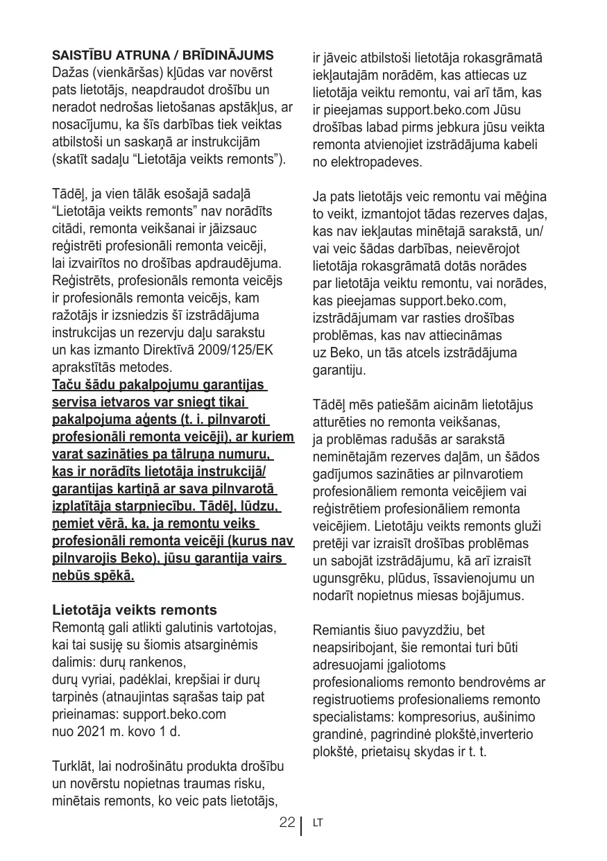 LT SAISTĪBU ATRUNA / BRĪDINĀJUMS Dažas (vienkāršas) kļūdas var novērst pats lietotājs, neapdraudot drošību un neradot nedrošas lietošanas apstākļus, ar nosacījumu, ka šīs darbības tiek veiktas atbilstoši un saskaņā ar instrukcijām (skatīt sadaļu “Lietotāja veikts remonts”). Tādēļ, ja vien tālāk esošajā sadaļā “Lietotāja veikts remonts” nav norādīts citādi, remonta veikšanai ir jāizsauc reģistrēti profesionāli remonta veicēji, lai izvairītos no drošības apdraudējuma. Reģistrēts, profesionāls remonta veicējs ir profesionāls remonta veicējs, kam ražotājs ir izsniedzis šī izstrādājuma instrukcijas un rezervju daļu sarakstu un kas izmanto Direktīvā 2009/125/EK aprakstītās metodes. Taču šādu pakalpojumu garantijas servisa ietvaros var sniegt tikai pakalpojuma aģents (t. i. pilnvaroti profesionāli remonta veicēji), ar kuriem varat sazināties pa tālruņa numuru, kas ir norādīts lietotāja instrukcijā/ garantijas kartiņā ar sava pilnvarotā izplatītāja starpniecību. Tādēļ, lūdzu, ņemiet vērā, ka, ja remontu veiks profesionāli remonta veicēji (kurus nav pilnvarojis Beko), jūsu garantija vairs nebūs spēkā. Lietotāja veikts remonts Remontą gali atlikti galutinis vartotojas, kai tai susiję su šiomis atsarginėmis dalimis: durų rankenos, durų vyriai, padėklai, krepšiai ir durų tarpinės (atnaujintas sąrašas taip pat prieinamas: support.beko.com nuo 2021 m. kovo 1 d. Turklāt, lai nodrošinātu produkta drošību un novērstu nopietnas traumas risku, minētais remonts, ko veic pats lietotājs, 22