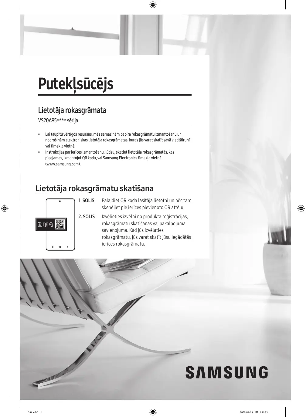 Lai taupītu vērtīgos resursus, mēs samazinām papīra rokasgrāmatu izmantošanu un nodrošinām elektroniskas lietotāja rokasgrāmatas, kuras jūs varat skatīt savā viedtālrunī vai tīmekļa vietnē. Instrukcijas par ierīces izmantošanu, lūdzu, skatiet lietotāja rokasgrāmatās, kas pieejamas, izmantojot QR kodu, vai Samsung Electronics tīmekļa vietnē (www.samsung.com). Lietotāja rokasgrāmatu skatīšana Untitled-5 1