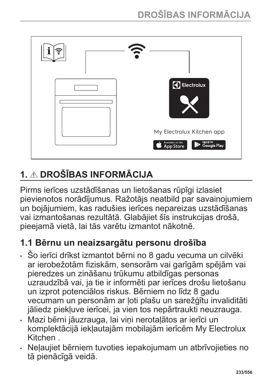Šo ierīci drīkst izmantot bērni no 8 gadu vecuma un cilvēki ar ierobežotām fiziskām, sensorām vai garīgām spējām vai pieredzes un zināšanu trūkumu atbildīgas personas uzraudzībā vai, ja tie ir informēti par ierīces drošu lietošanu un izprot potenciālos riskus. Bērniem no līdz 8 gadu vecumam un personām ar ļoti plašu un sarežģītu invaliditāti jāliedz piekļuve ierīcei, ja vien tos nepārtraukti neuzrauga. Mazi bērni jāuzrauga, lai viņi nerotaļātos ar ierīci un komplektācijā iekļautajām mobilajām ierīcēm My Electrolux Kitchen . Neļaujiet bērniem tuvoties iepakojumam un atbrīvojieties no tā pienācīgā veidā. 233/556