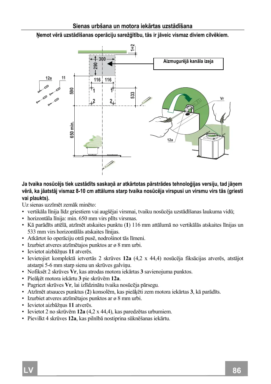 • une ligne horizontale à : 650 mm min. au-dessus du plan de cuisson. • Marquer comme indiqué, un point de référence (1) à 116 mm de la ligne verticale de référence et 533 mm au-dessus de la ligne horizontale de référence. • Répéter cette opération sur le côté opposé, en vérifiant le nivellement. • Percer ø 8 mm les points marqués. • Insérer les chevilles 11 dans les trous. • Serrer les 2 vis 12a (4,2 x 44,4) fournies dans les trous prévus, en laissant un espace de 5-6 mm entre la paroi et la tête de la vis. • Serrer les 2 vis Vr situées sur les points d’accrochage du groupe moteur 3. • Accrocher le groupe moteur aux 3 vis 12a. • Intervenir sur les vis Vr pour niveler le corps de hotte. • Marquer, comme indiqué, les points de référence (2) des brides accrochées sous le groupe moteur 3. • Percer ø 8 mm les points marqués. • Insérer les chevilles 11 dans les trous. • Serrer 2 vis 12a (4,2 x 44,4) fournies dans les trous. • Serrer définitivement les 4 vis 12a qui fixent le groupe aspirateur.